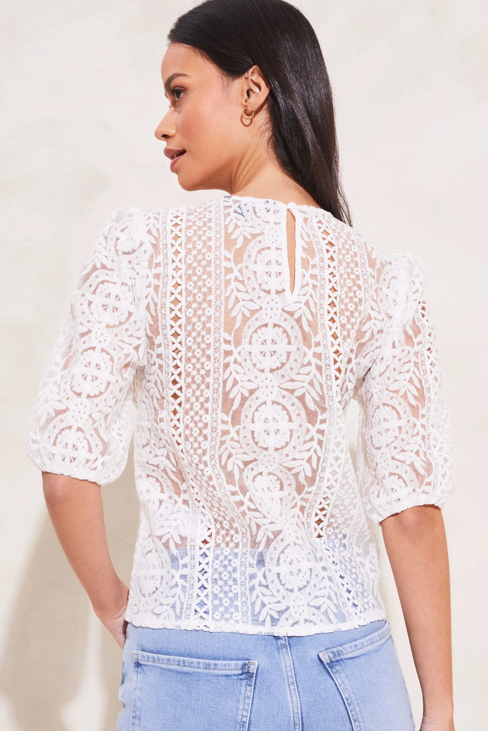 A stylish all over patterned lace top from Lipsy featuring short puff sleeves and an elegant round neck.
