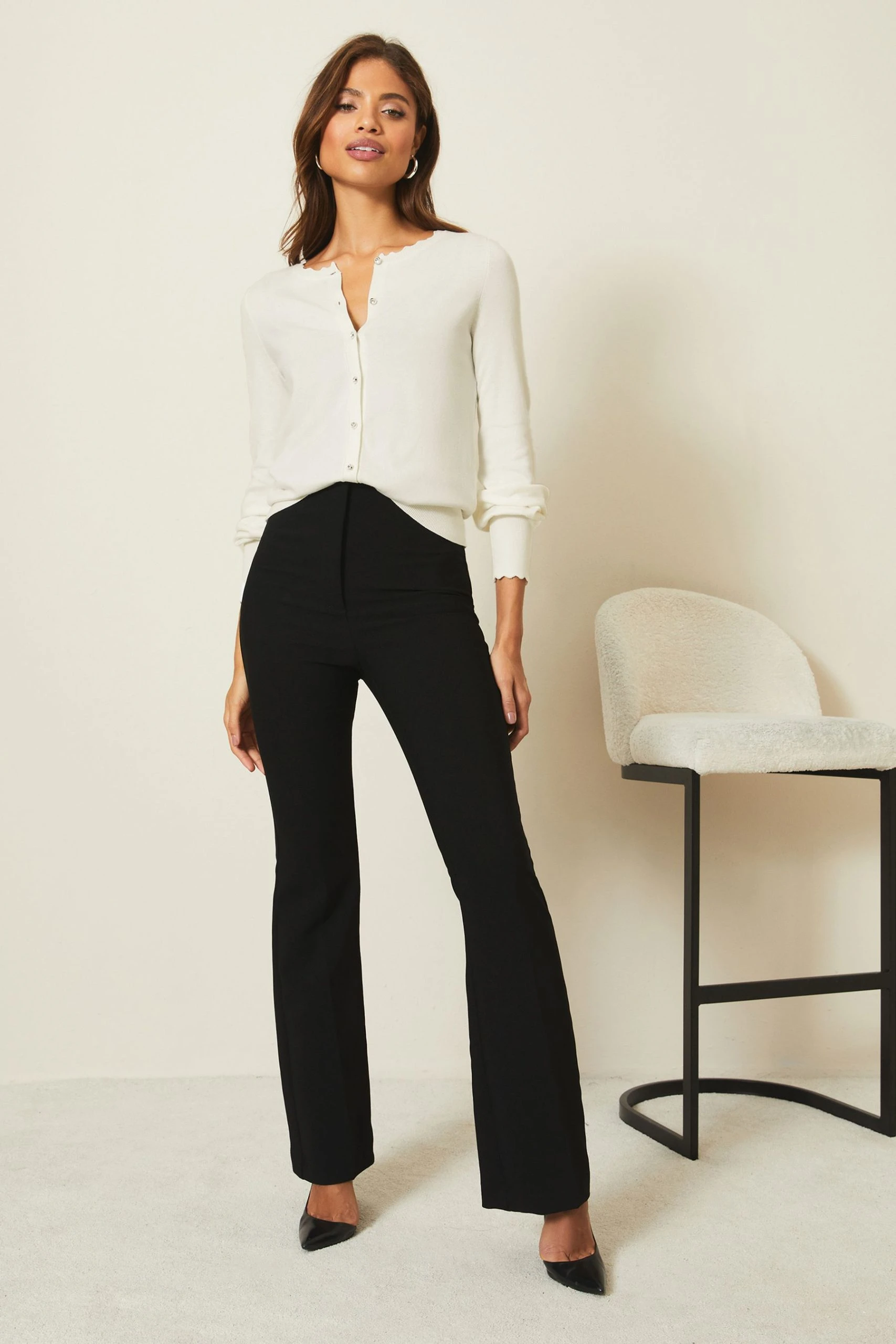 A classic piece your can wear all year round. Lipsy fine gauge knitted cardigan in long sleeve with scallop trim detailing and tipping. Model wears UK 8.
