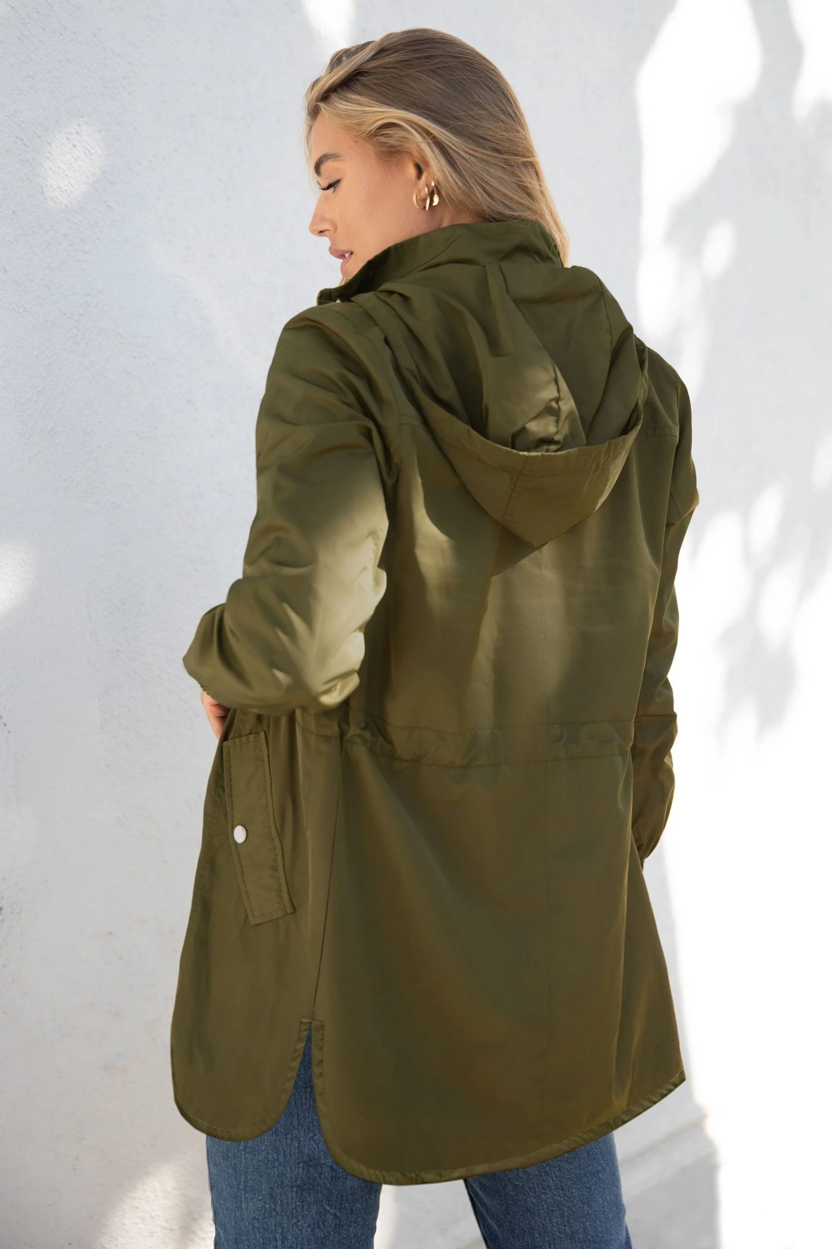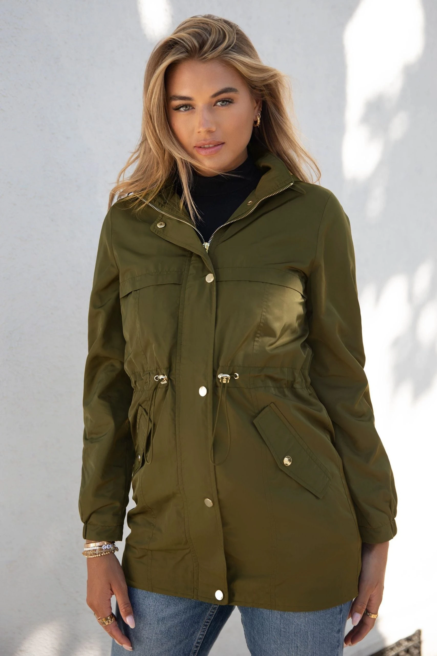This rain jacket is made from a lightweight fabric with shower resistant coating to provide protection from light rain. Designed with drawcord detail at the waist to give a flattering silhouette. Finished with pockets and metallic trims. Model wears size 8.