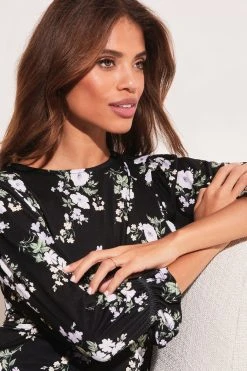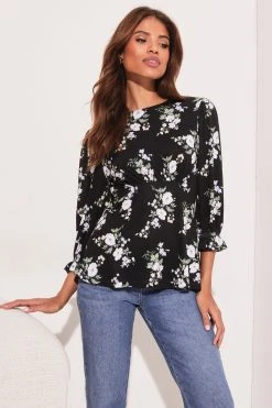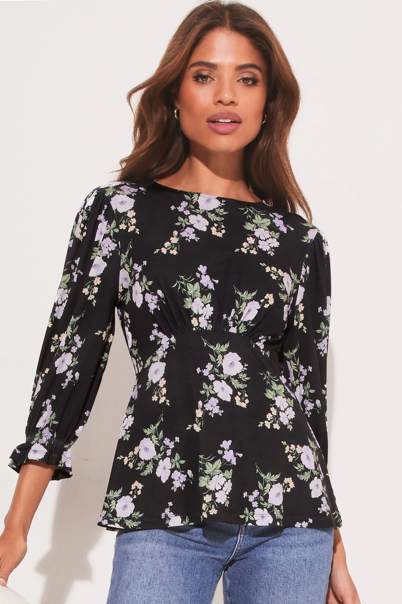 A comfortable jersey top with underbust detail. The 3/4 length sleeves are finished with a ruffled cuff for ease. This top is perfect for everyday wear.