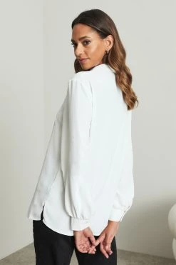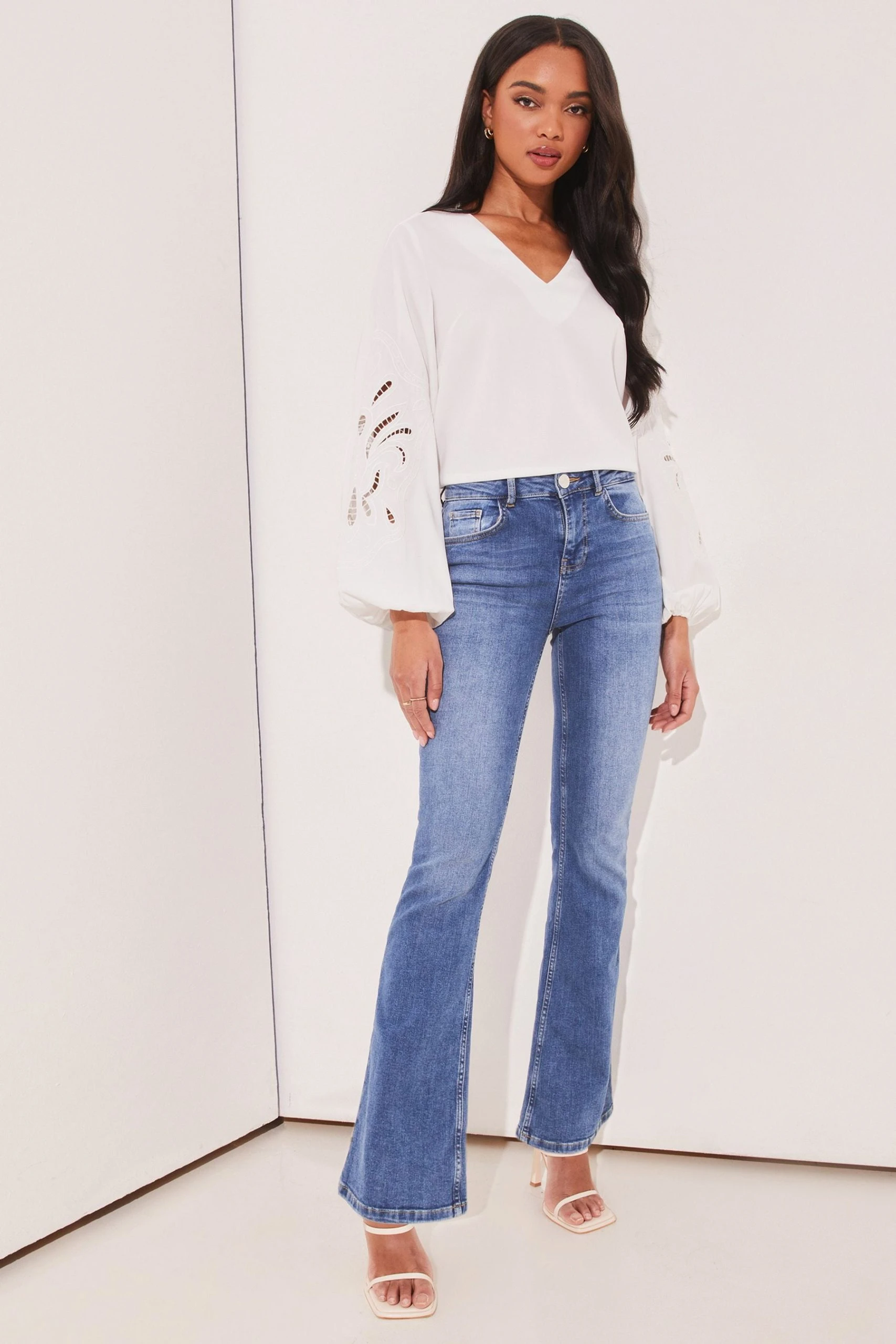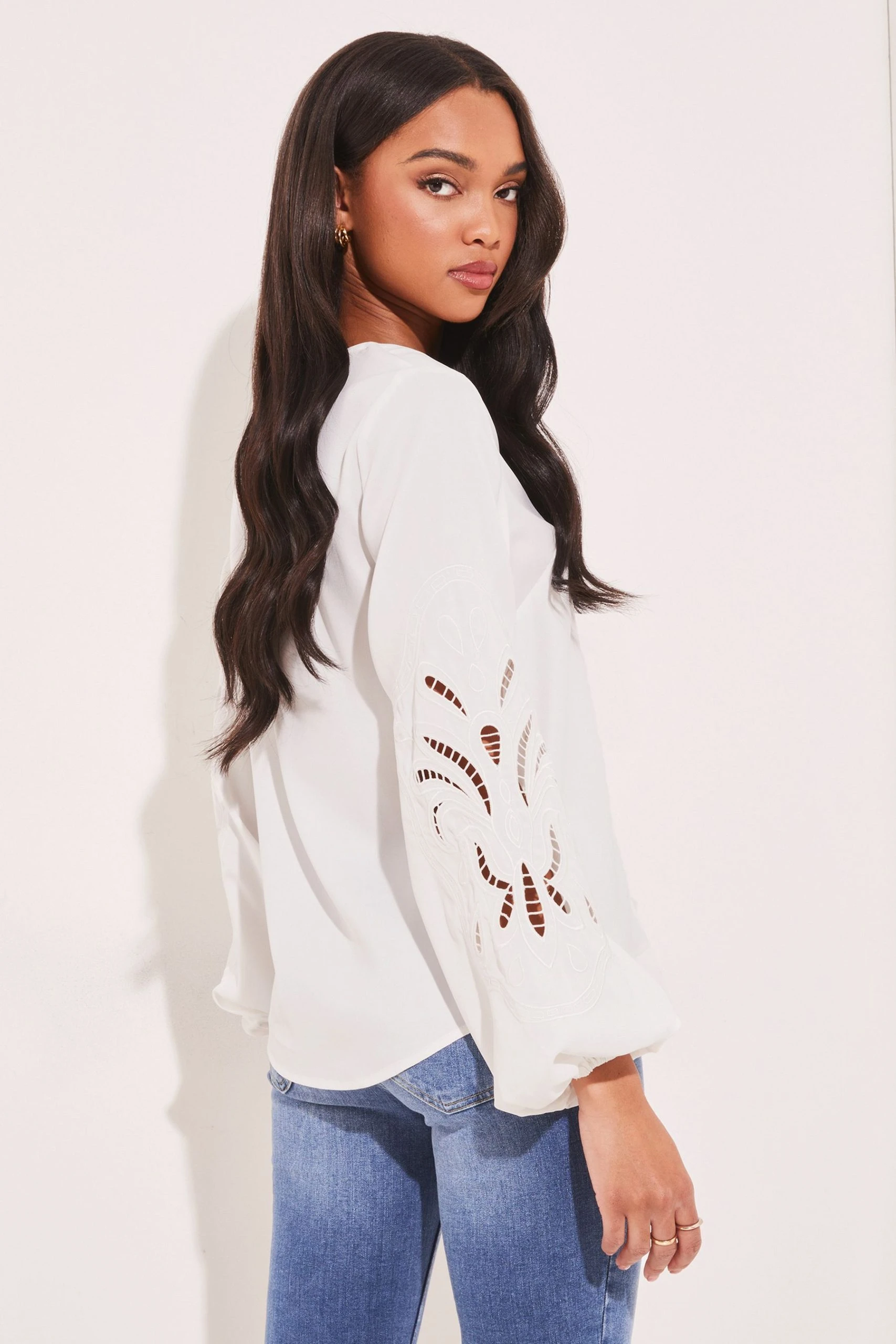 Blouse from Lipsy. This style features a v neckline and cut out artwork detail on the sleeves. Perfect for desk to dinner.