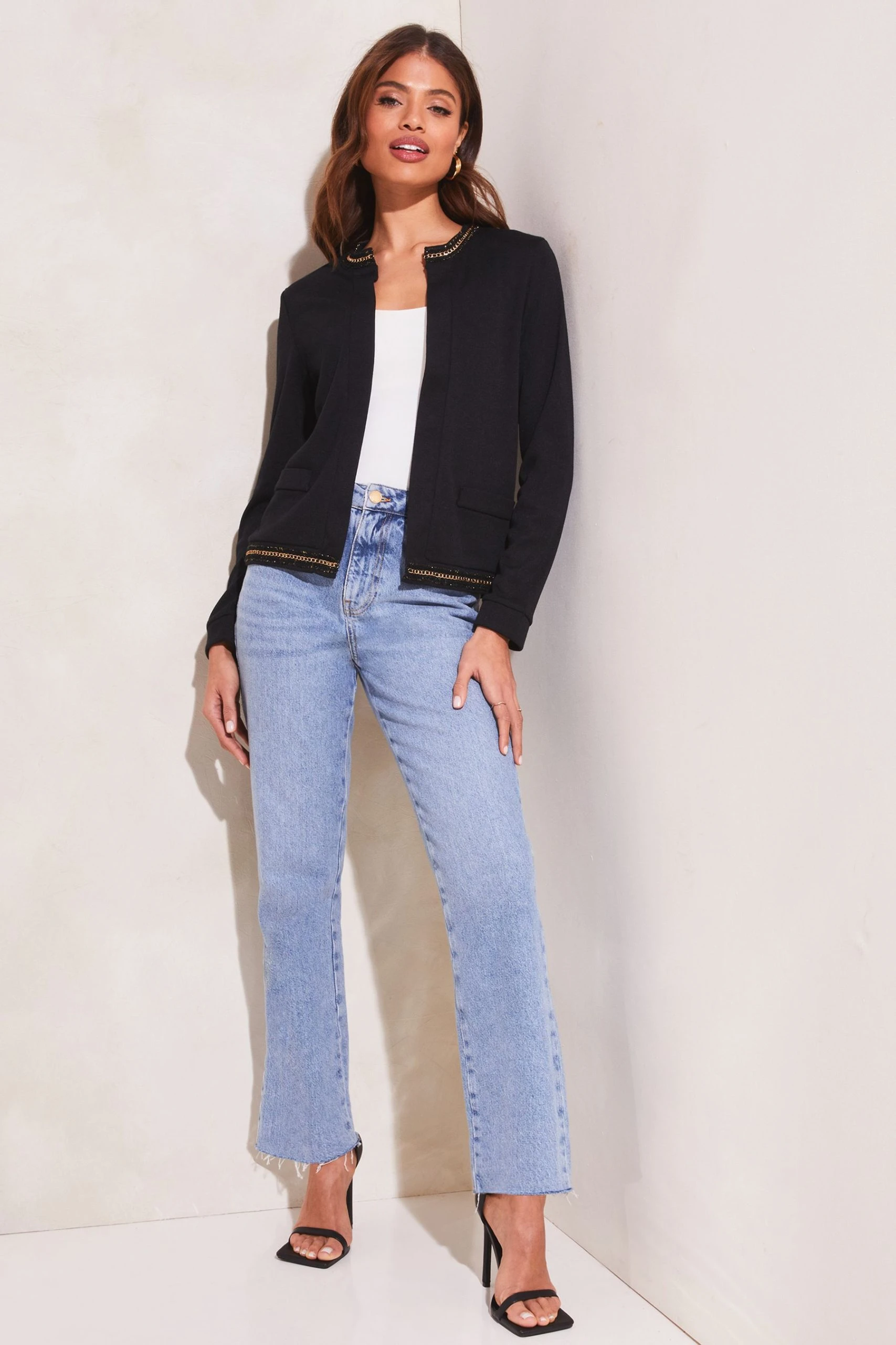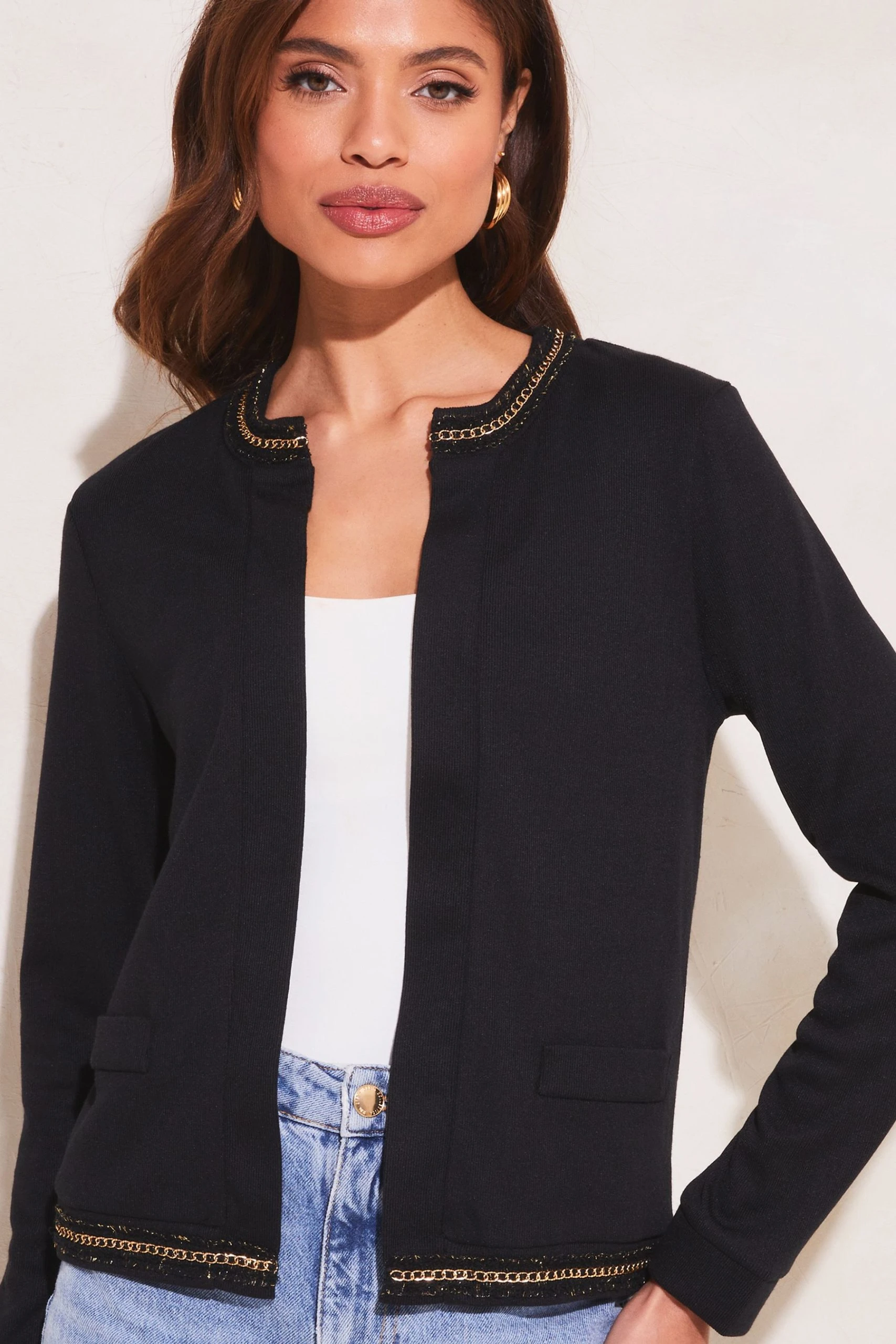 Step out in style in this jersey cardigan from Lipsy. This style is regular length and features a gorgeous boucle chain detail on the neck and hem. This style also has two front pockets.