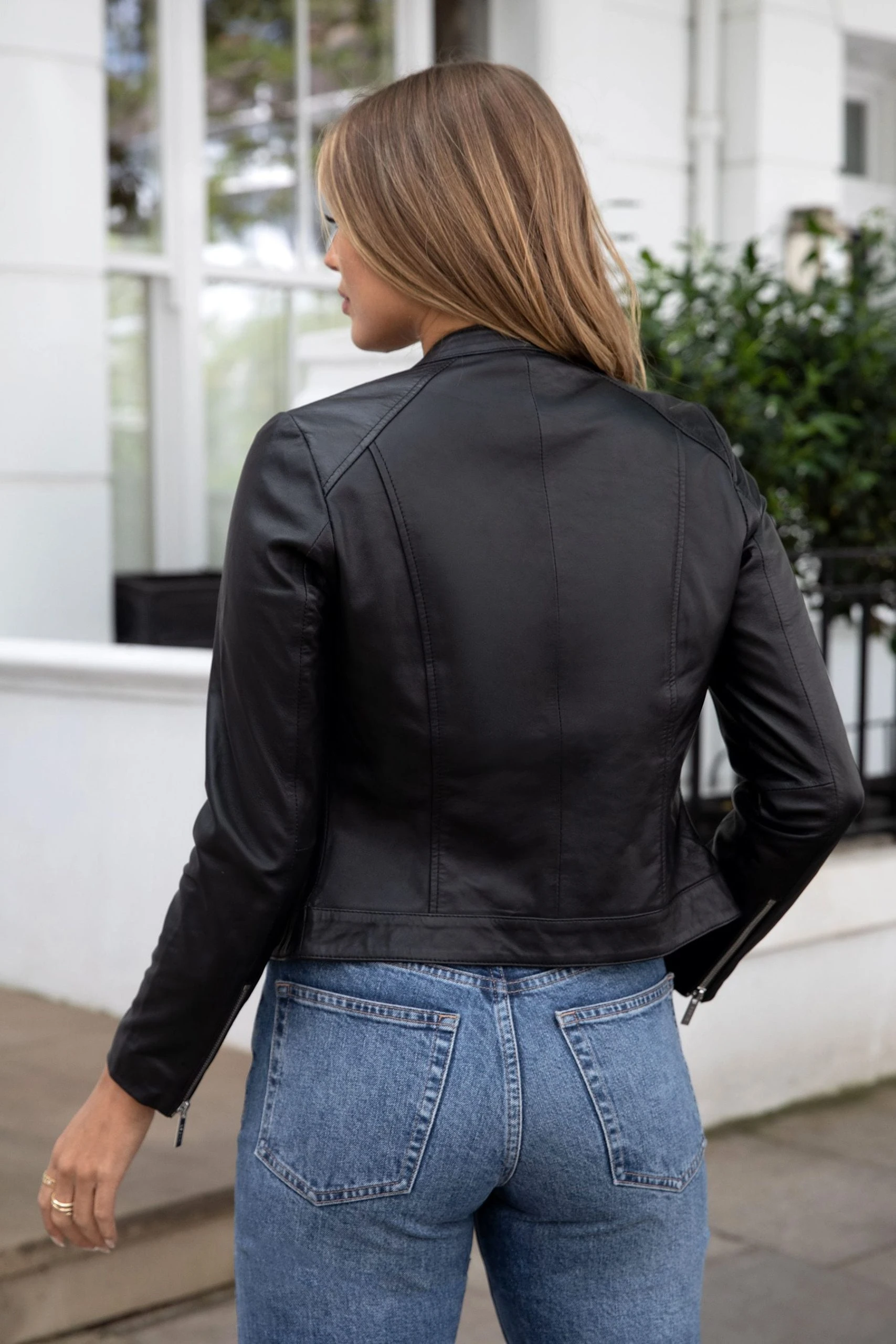 This collarless leather jacket is made from a soft real leather. Designed with zip pockets and cuffs. Fully lined and finished with Lipsy branded trims.