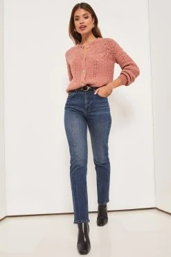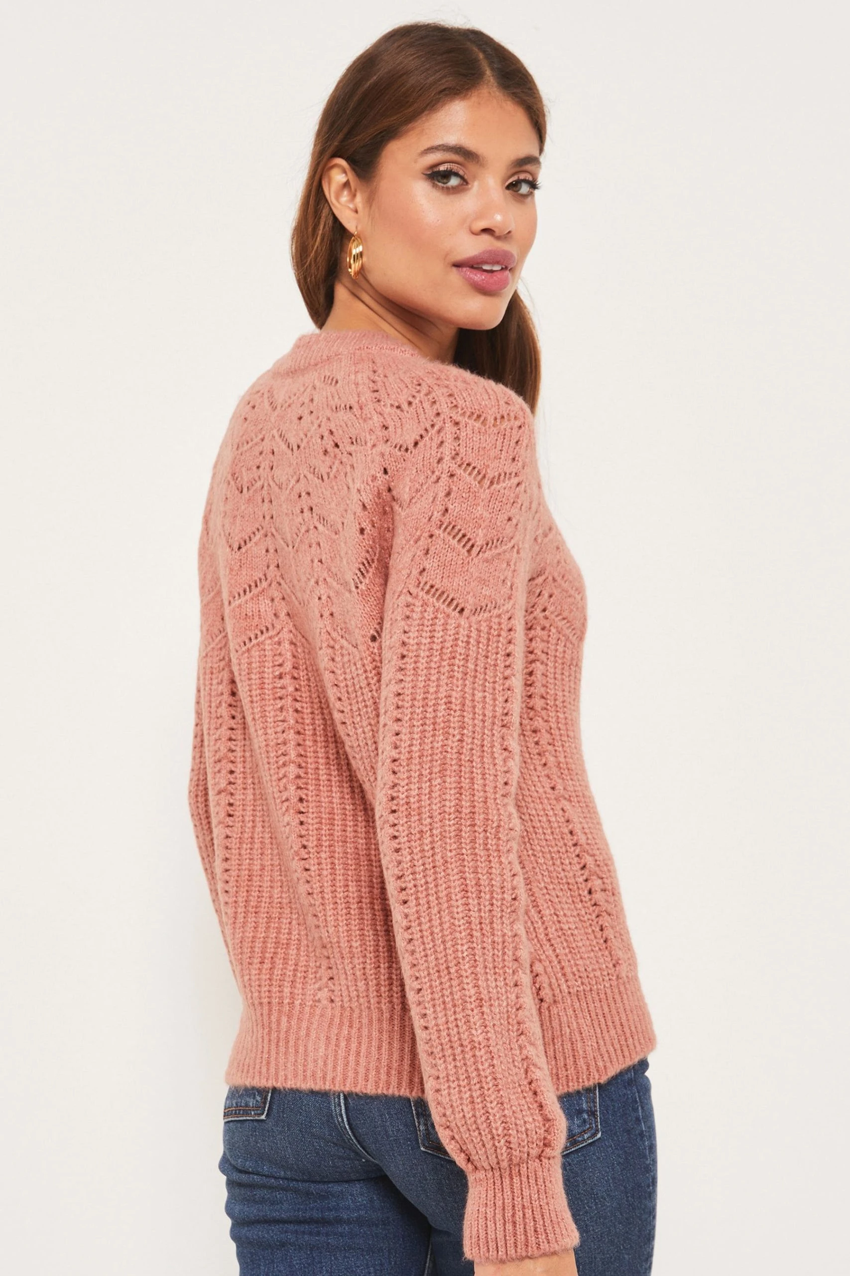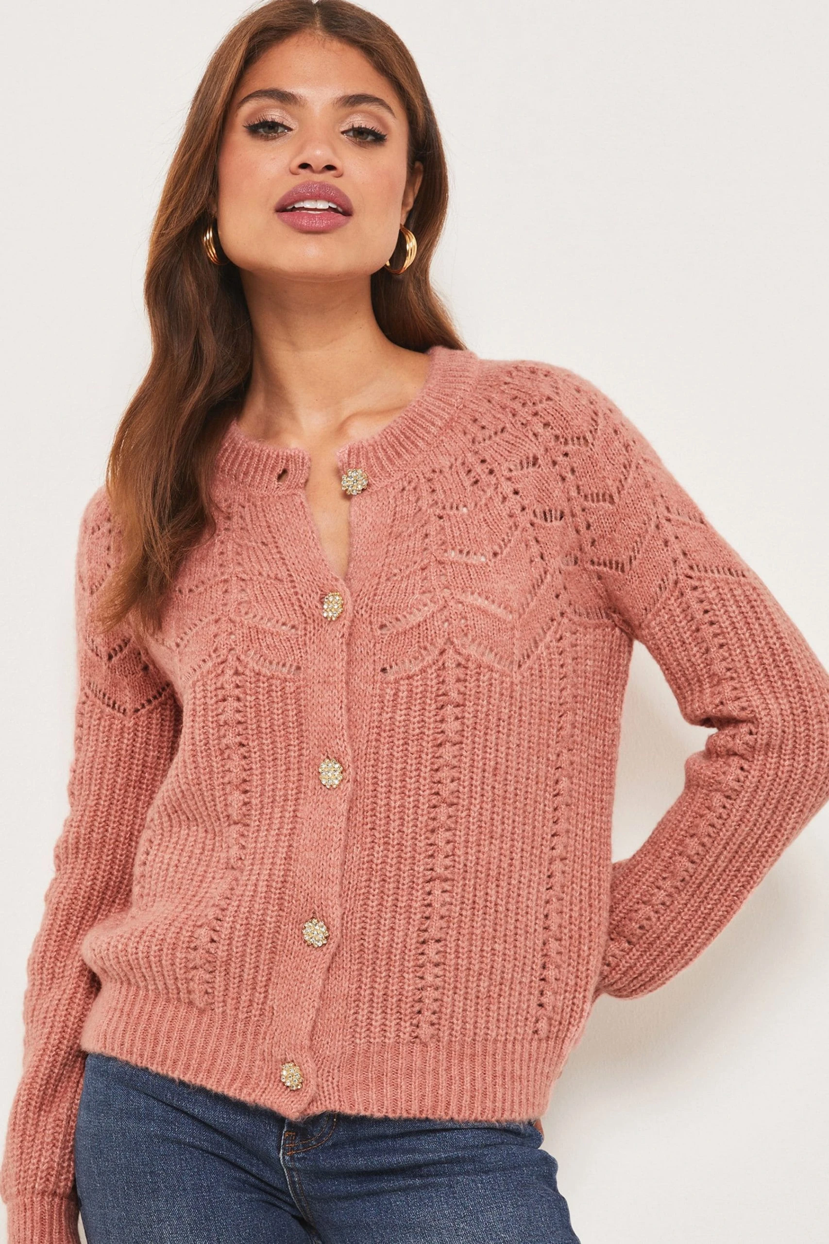 A cosy pointelle caridgan from Lipsy featruing gorgeous embelsihed buttons. Model wears size UK8.
