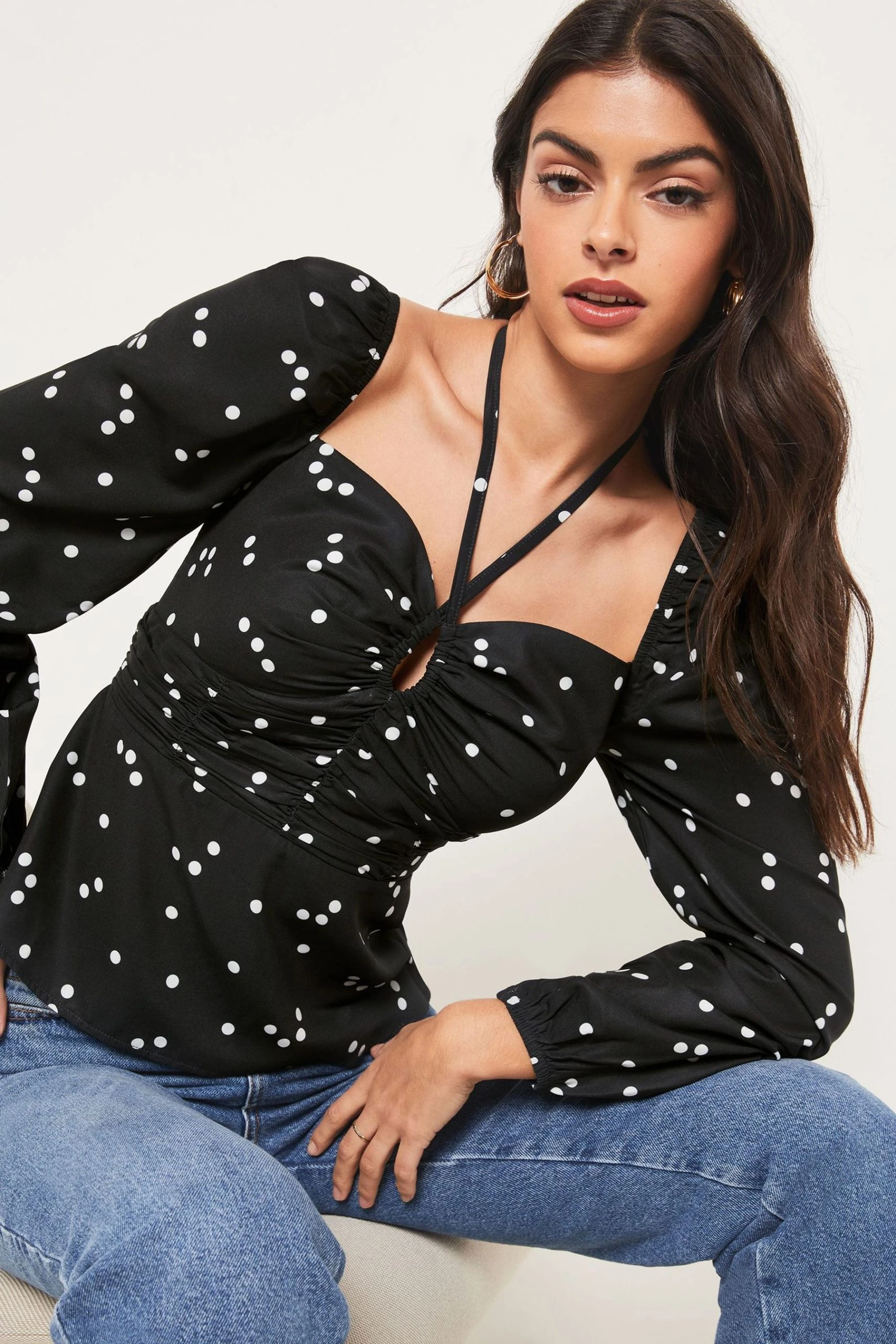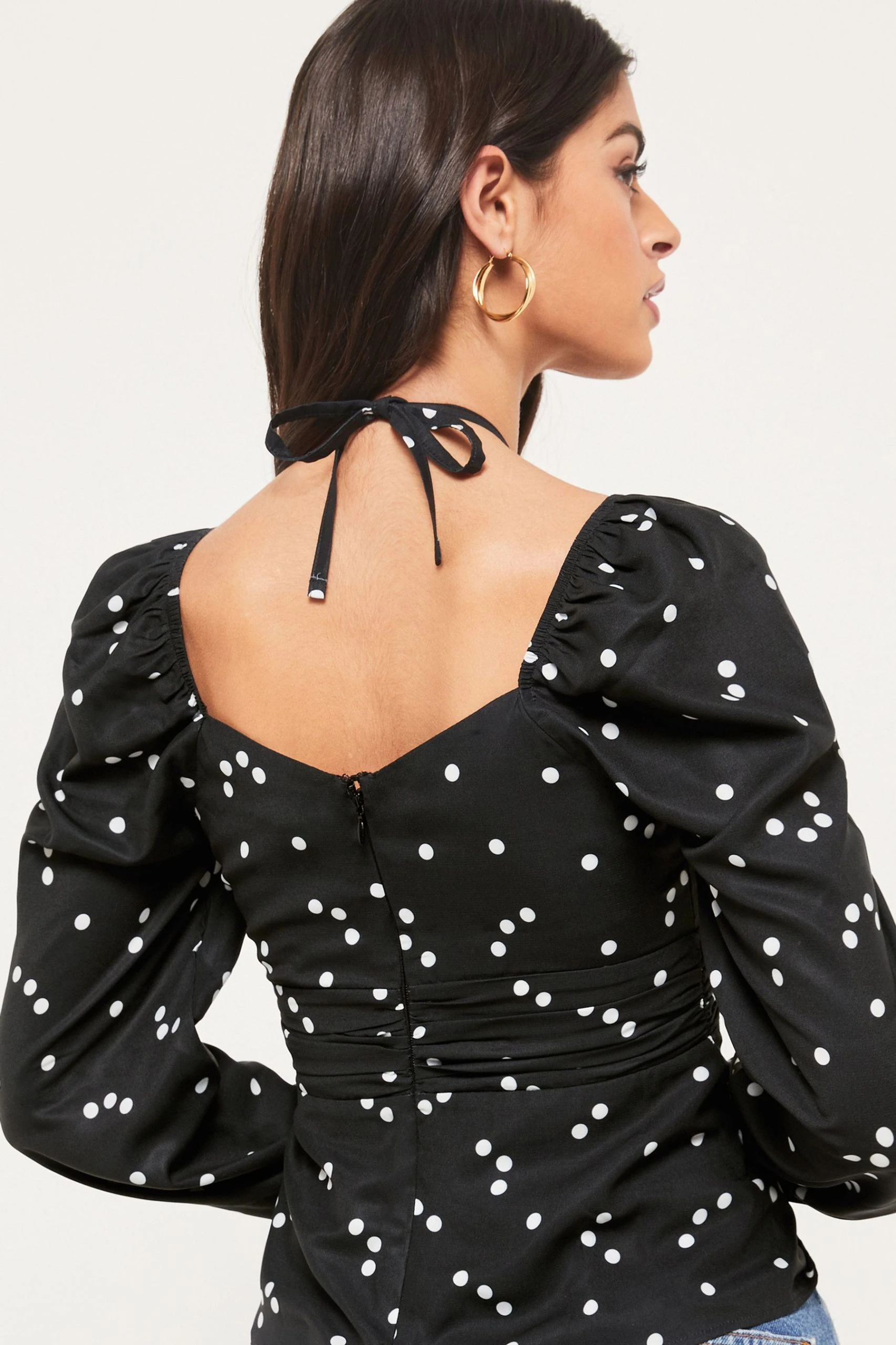 A cross front neck tie printed top. Featuring a sweetheart neckline, ruched front and keyhole detailing. Long sleeved top ideal for any occassion or daywear.