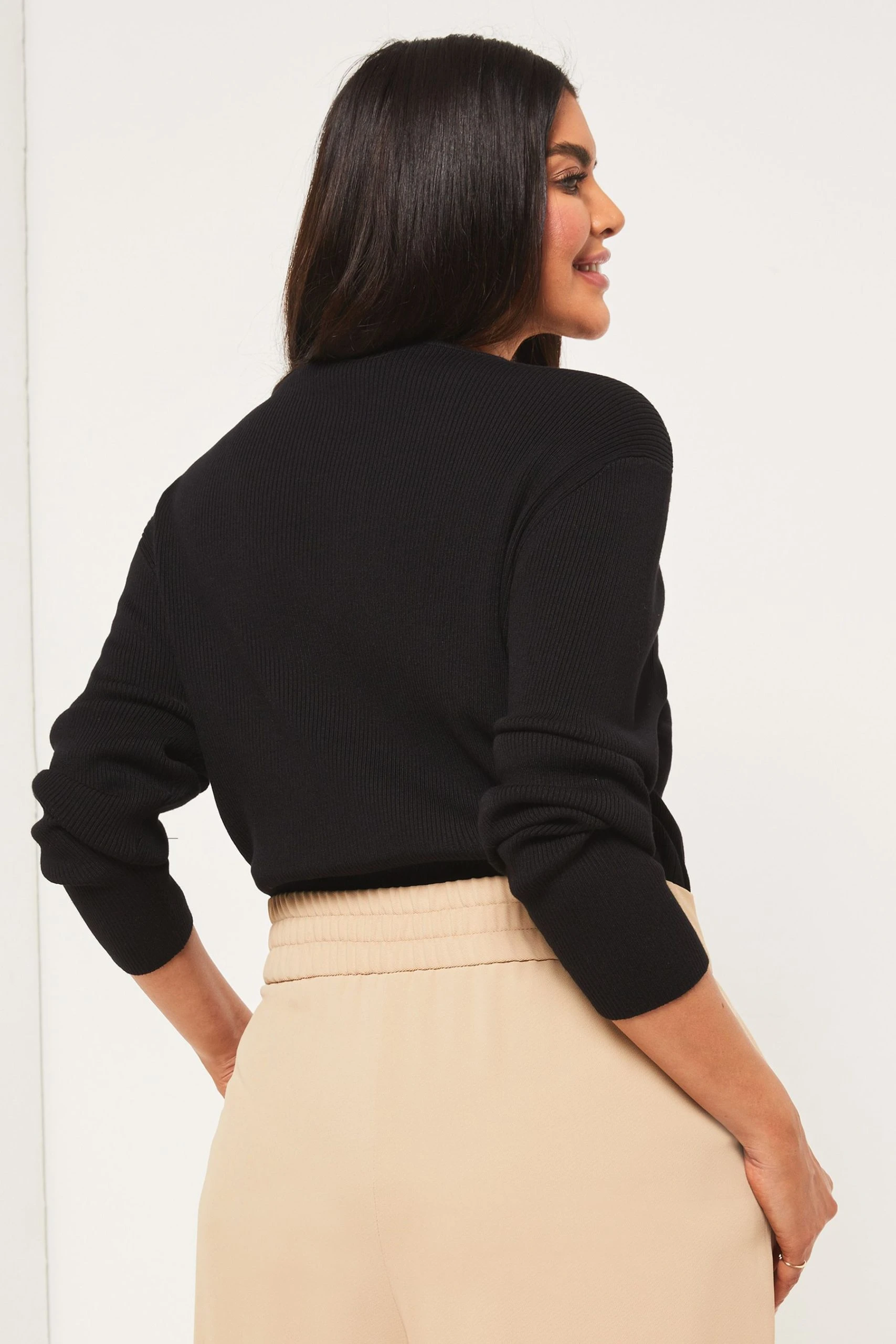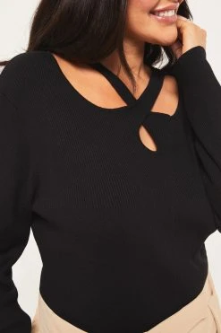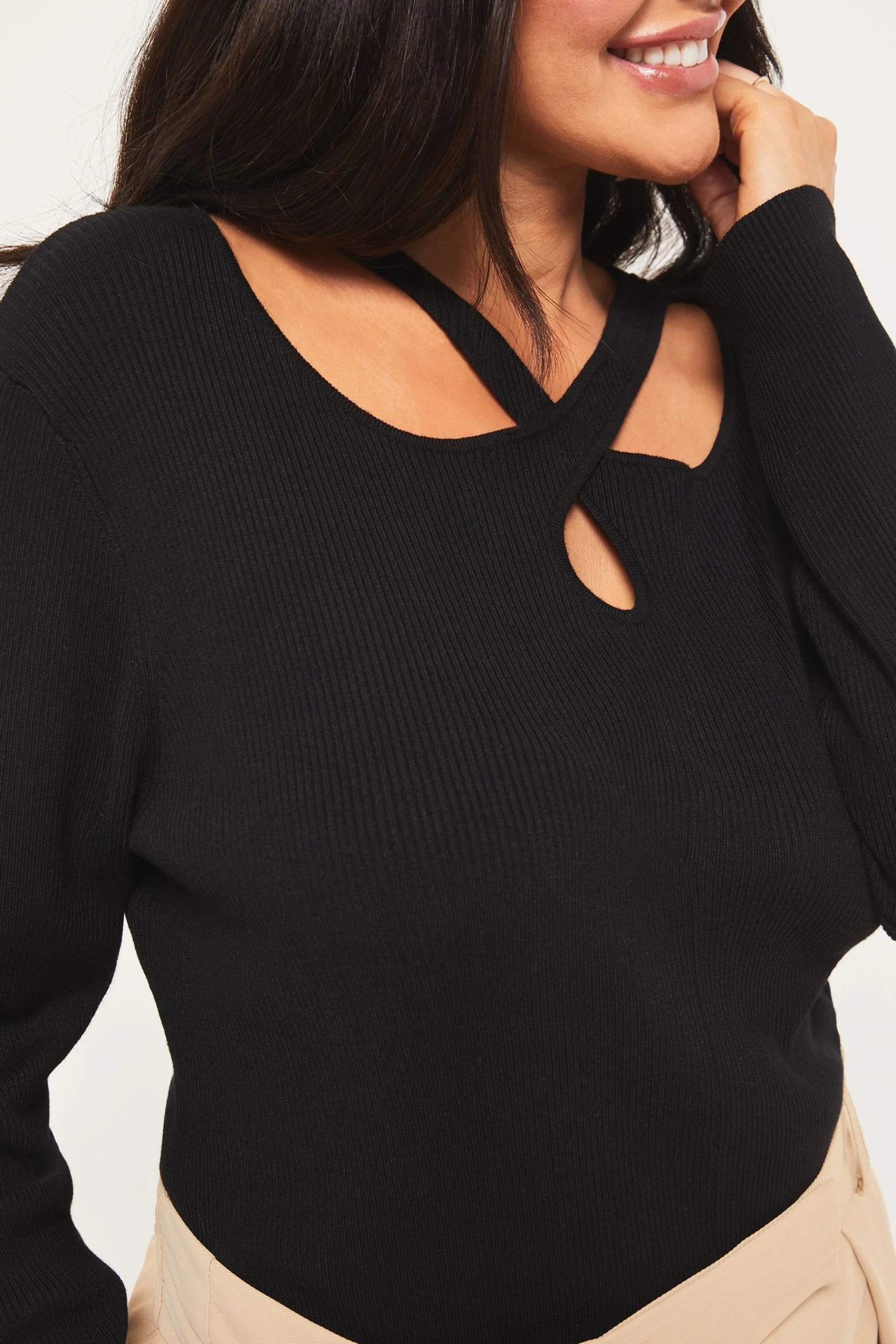 Long sleeve knit top featuring a criss cross cut out detail around neckline. Perfect for desk to dinner.