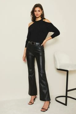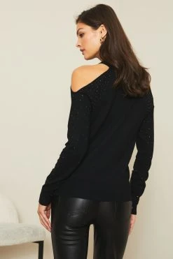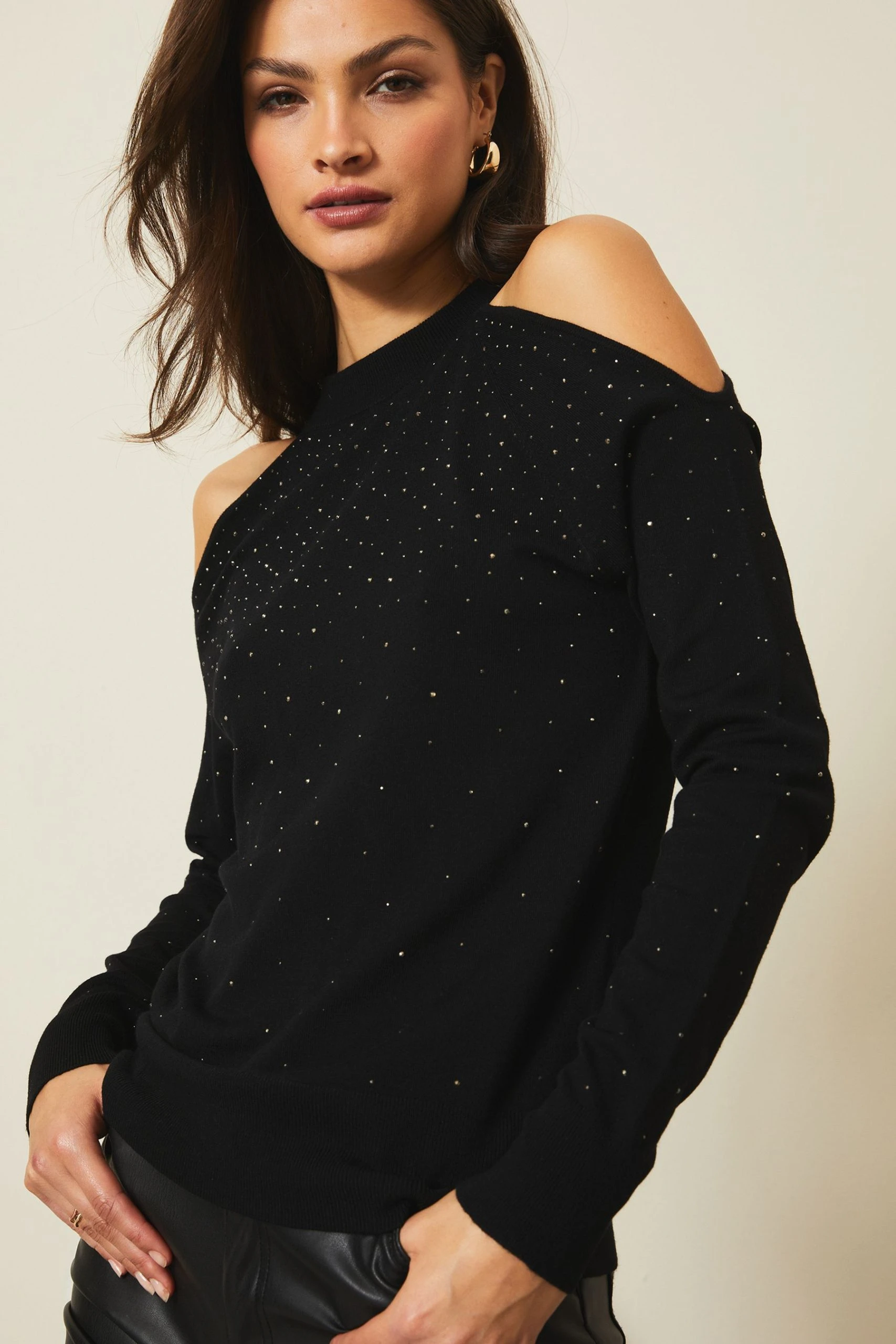 A cut out jumper featuring gorgeous embelsihedments, wear with pu leggings or jeans for the ultimate effortlessly glamorous look. Model wears size UK8.