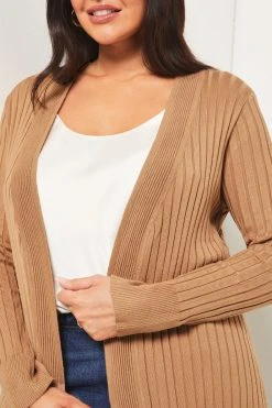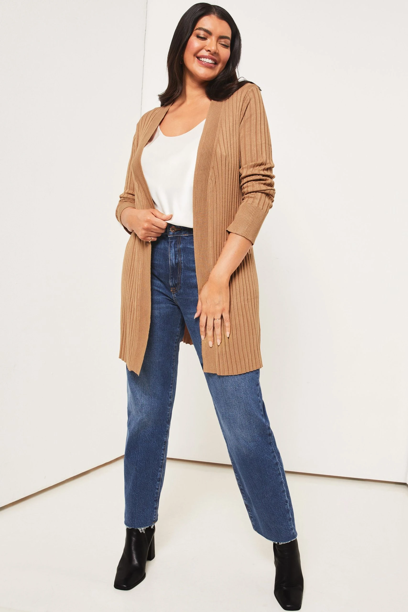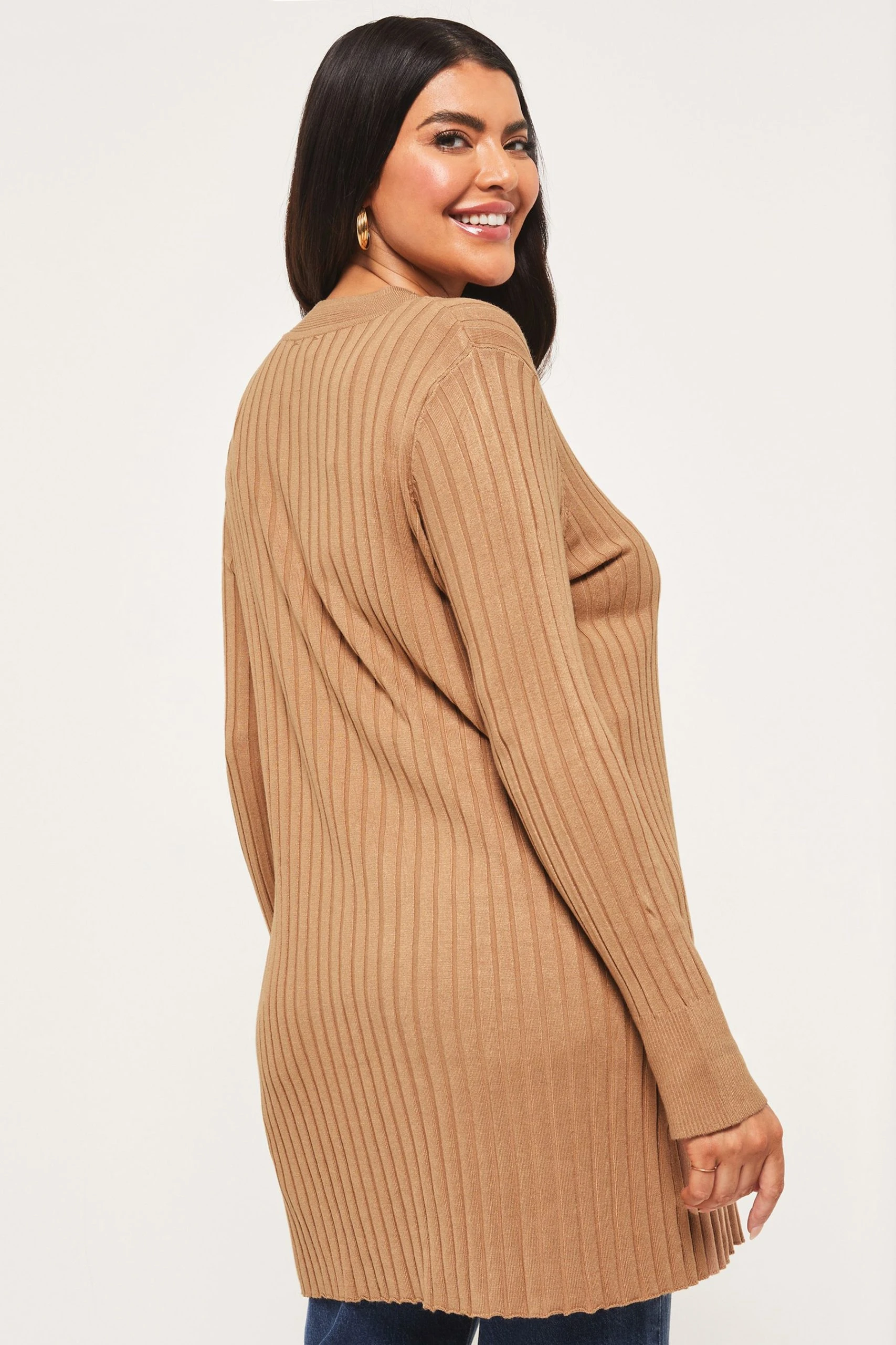 Edge to edge ribbed cardigan. Model wears size UK8.