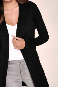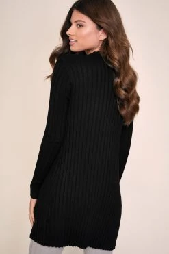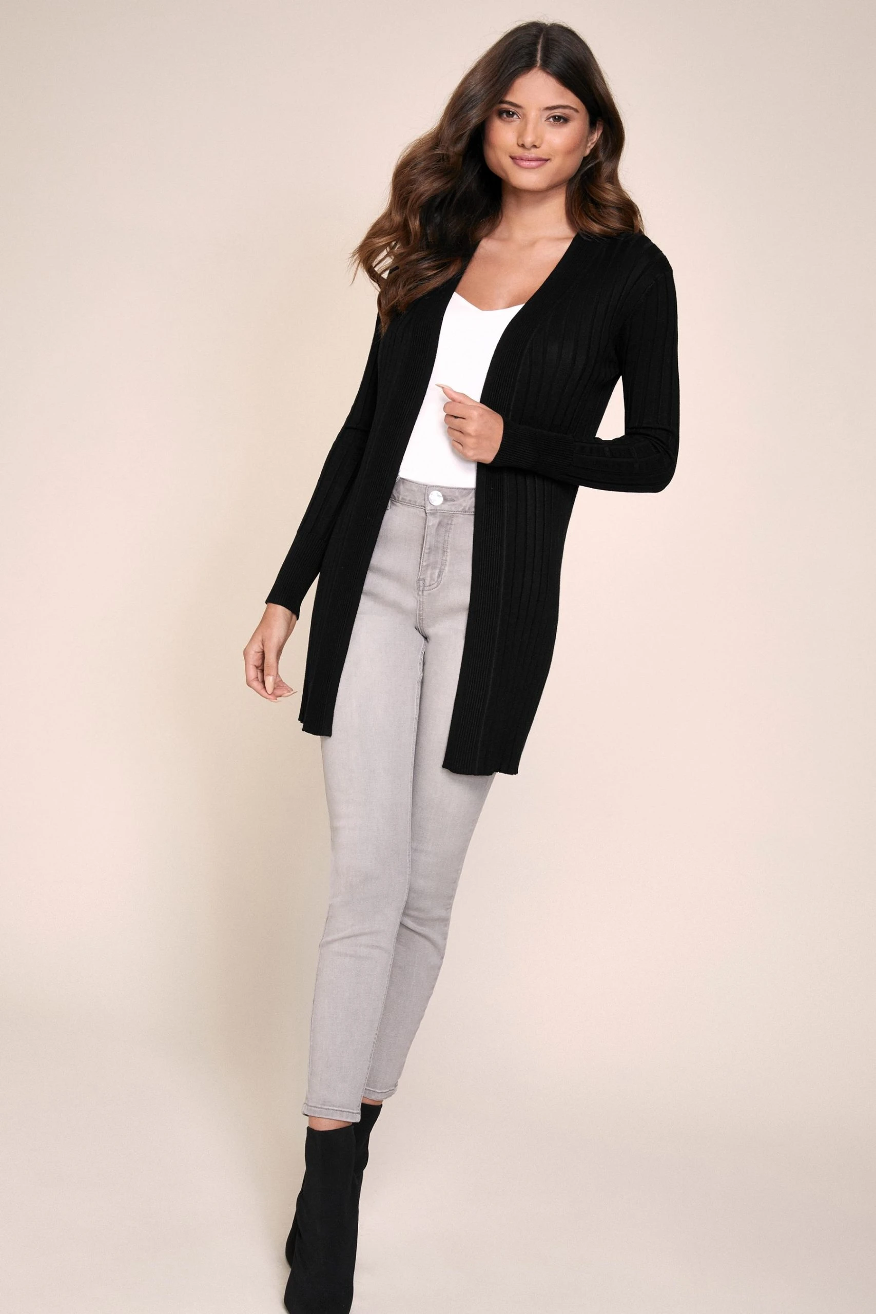 Edge to edge ribbed cardigan. Model wears size UK8.