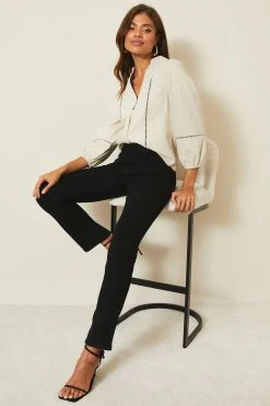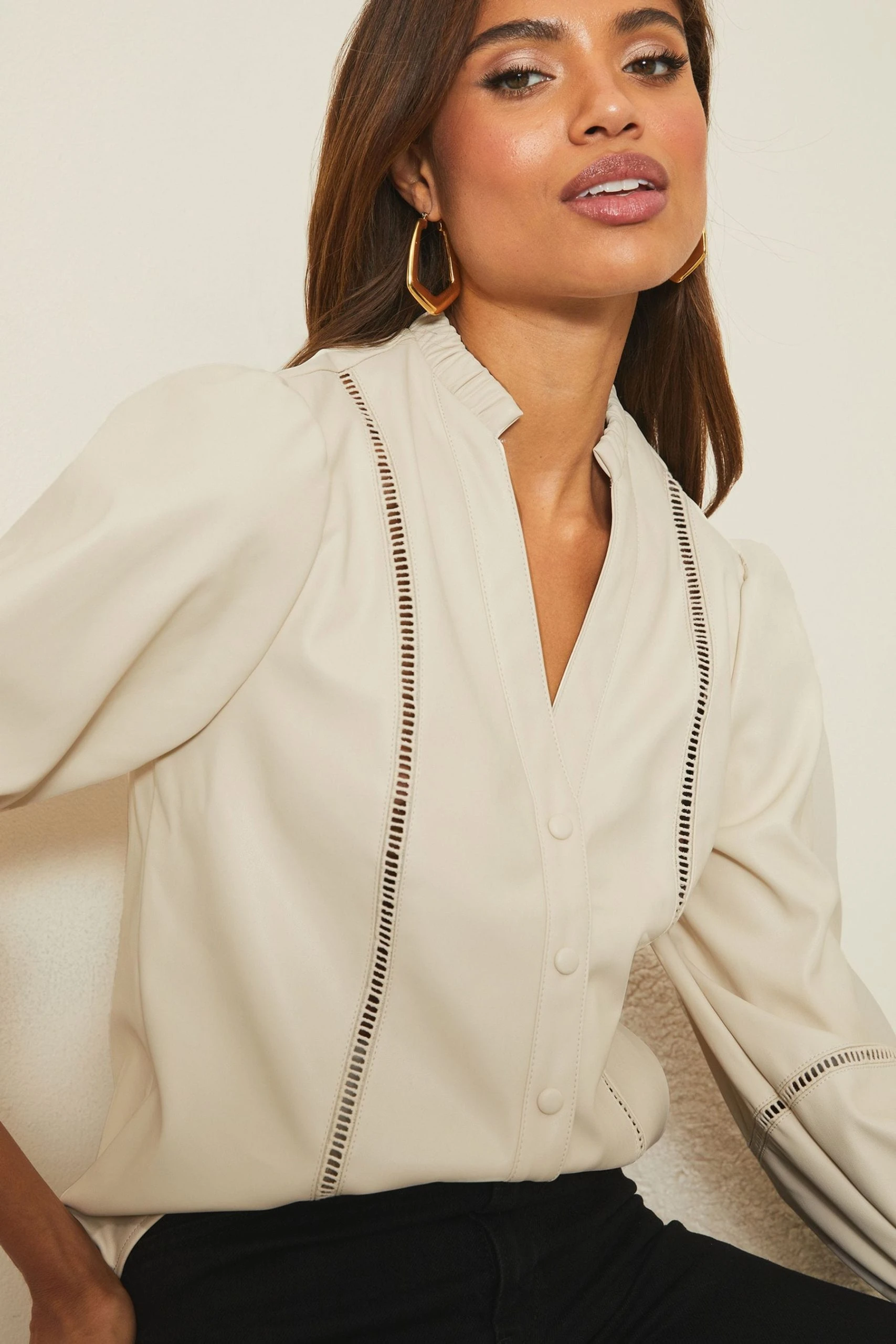 A faux leather dyed to match ladder trim top, with 3/4 length elasticated cuff sleeves. Made from premium faux leather fabrication. Model is wearing a size 8.