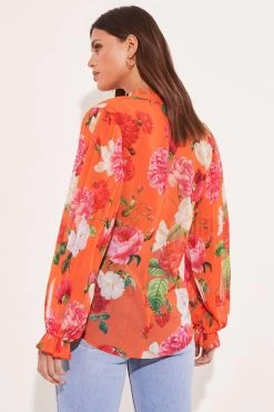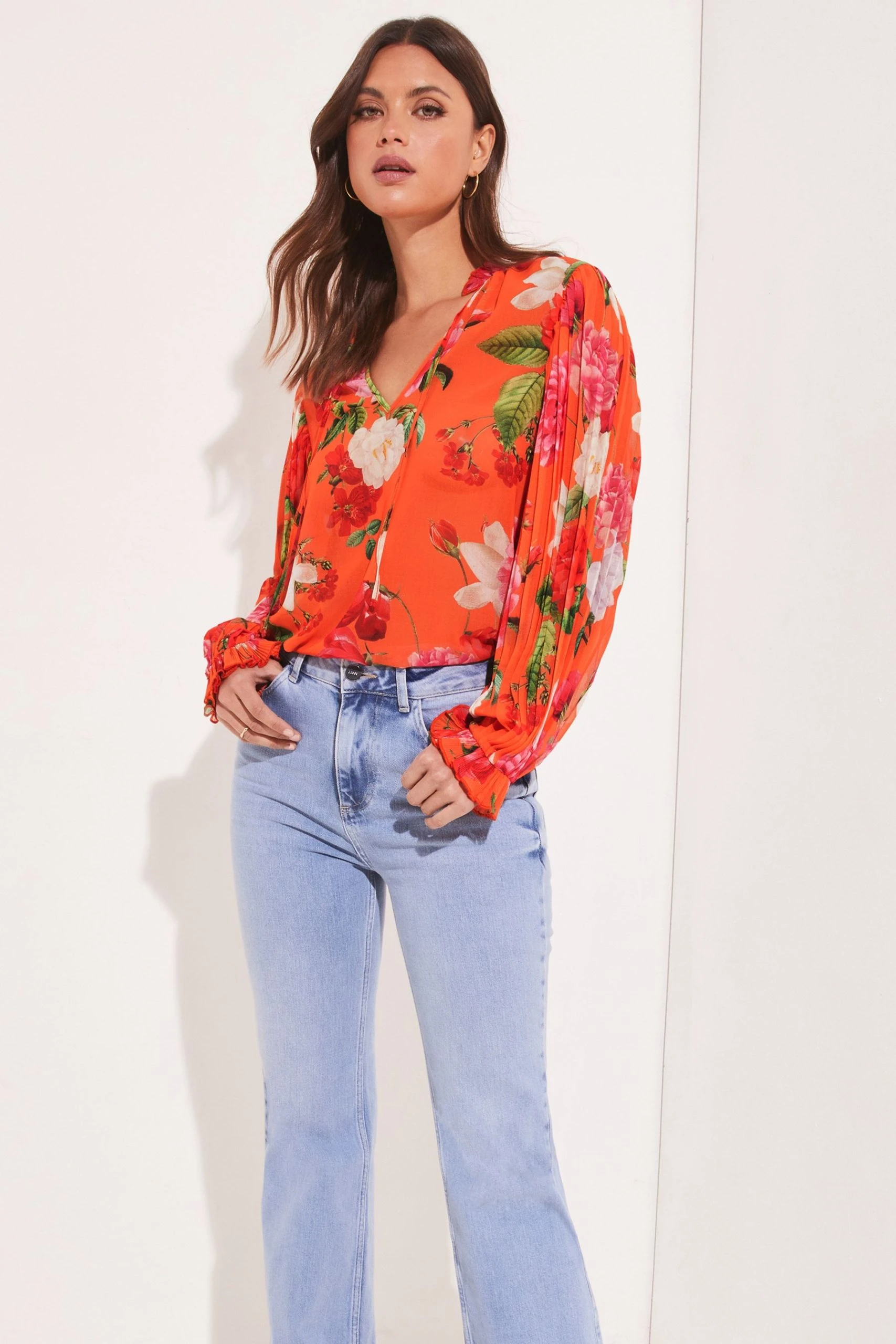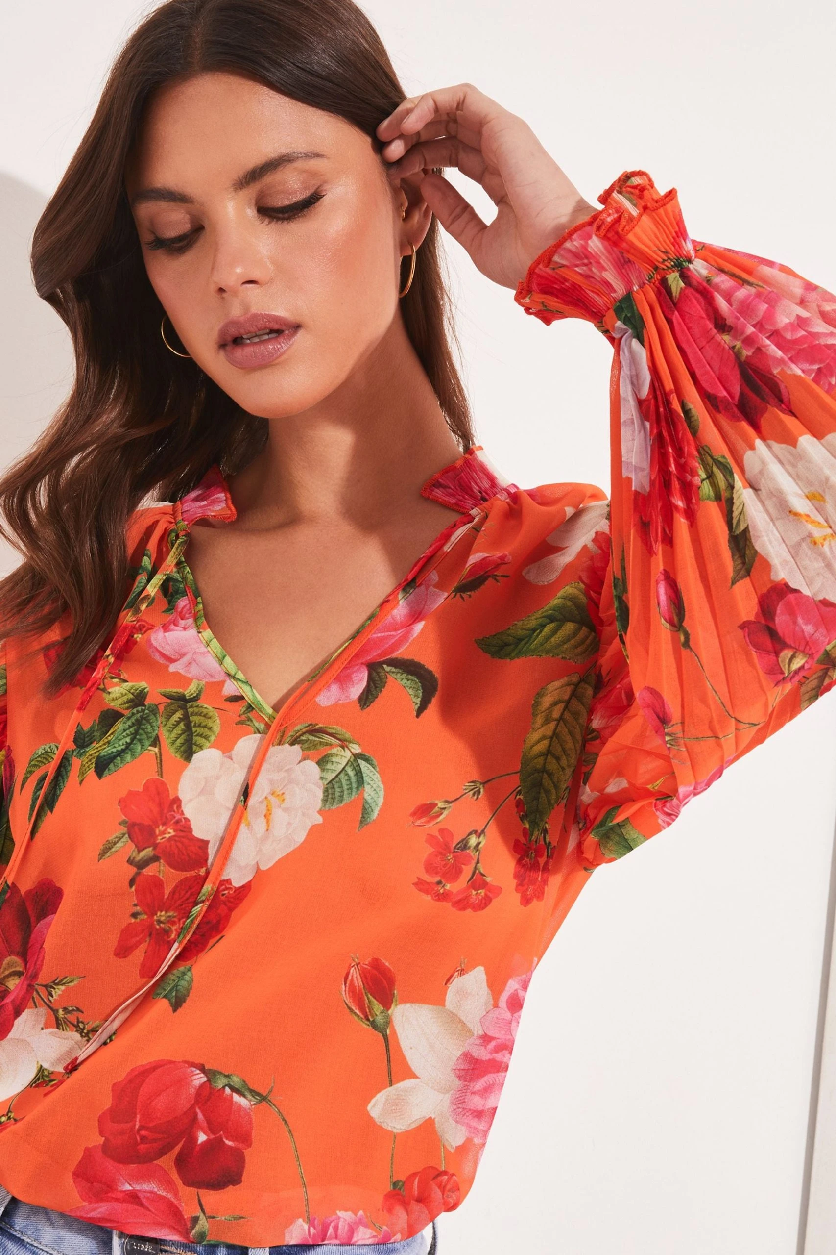 Update your wardrobe with this simple but stylish blouse. This style features pleated ruffle detailing on the neck and cuff as well as a tie neck.