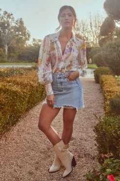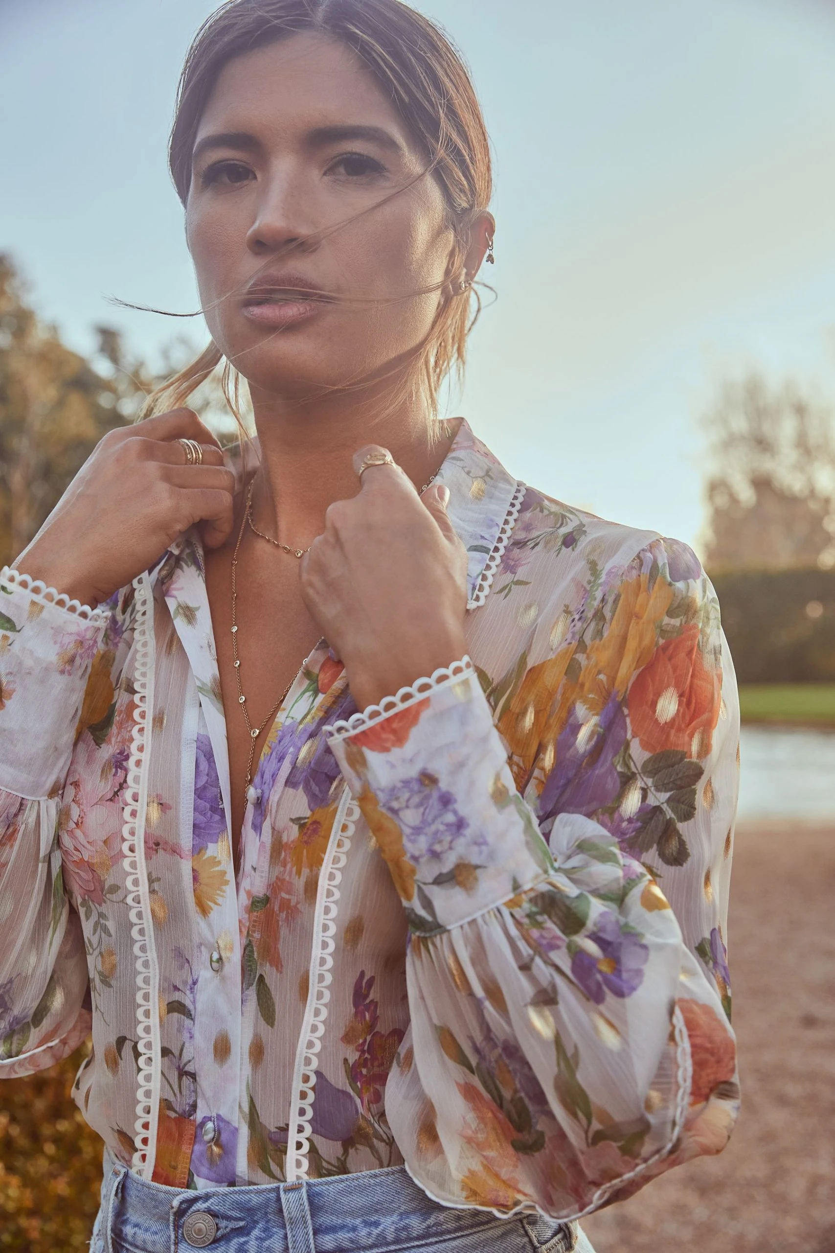 Tie front shirt featuring a trim detail. This gorgeous shirt is made from chiffon fabric with gold foil and can be dressed up or down making it a Spring/Summer wardrobe essential.