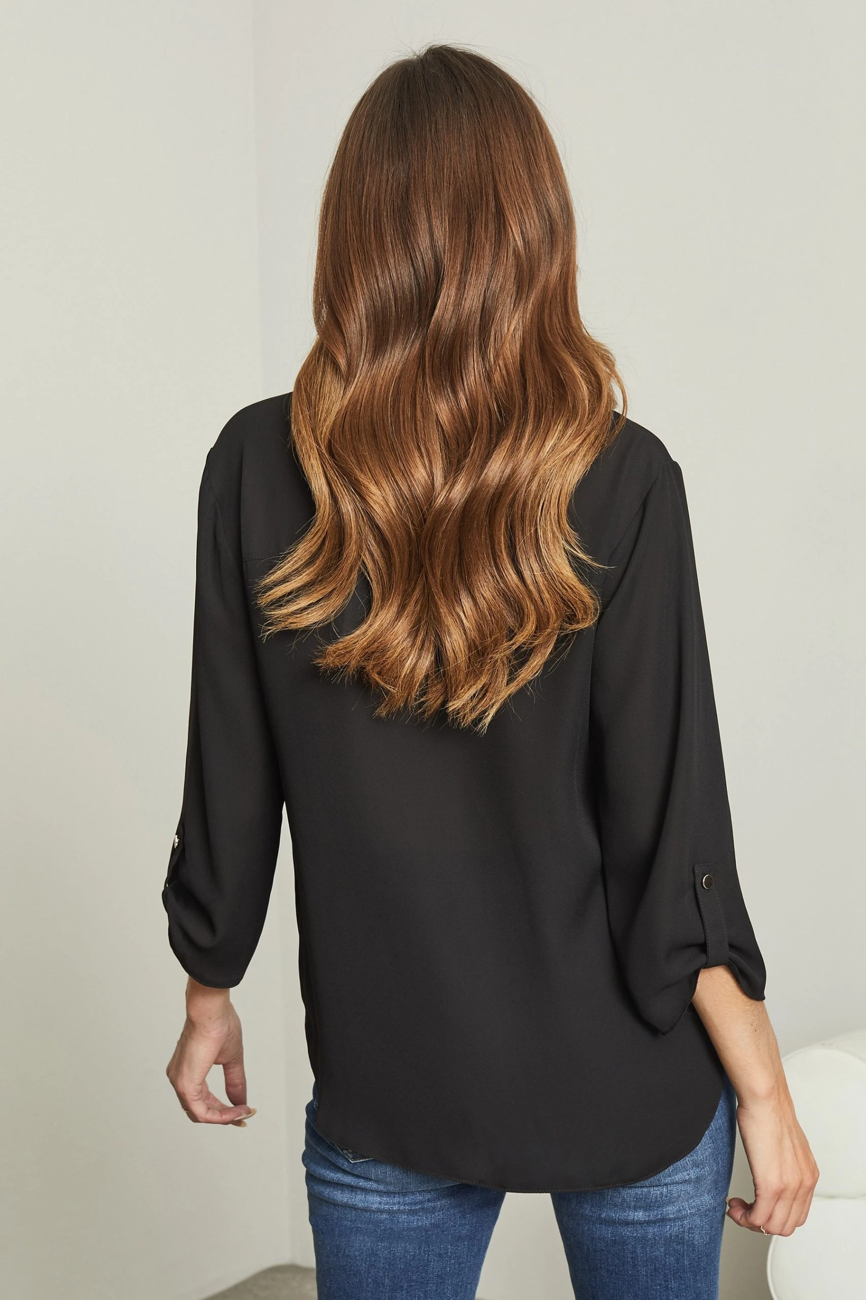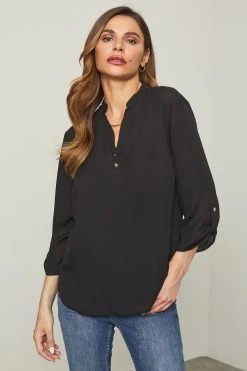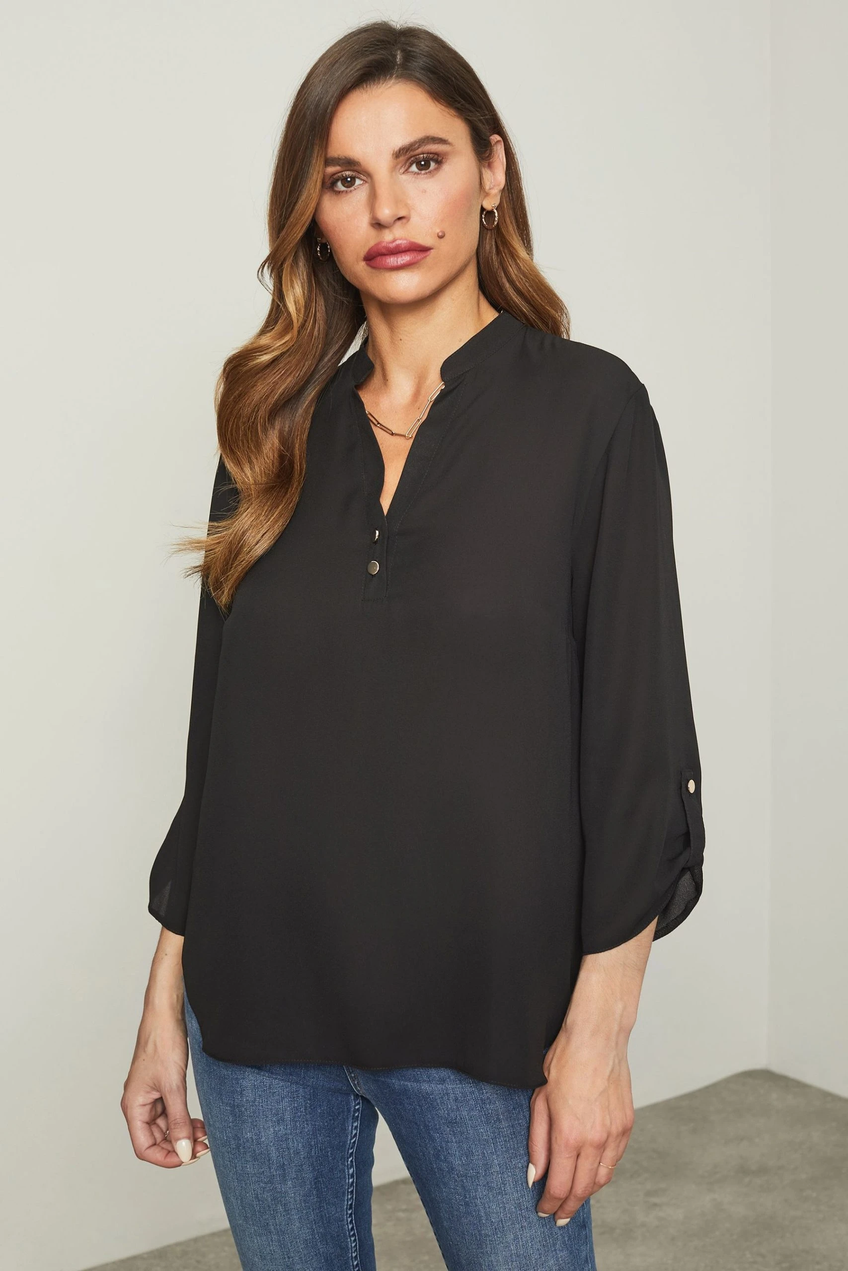 Regular fit grandad collar blouse from Lipsy. This style has 3/4 sleeve finishing just below the elbow with a turn up design. Featuring gold hardware at the centre front neck to add an elevated touch.