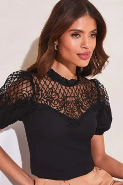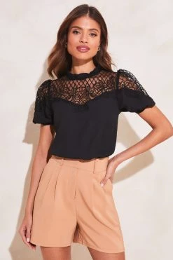 This T-shirt from Lipsy is regular length with a puff sleeve and features a lace yoke. Perfect for desk to dinner.
