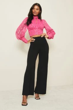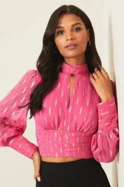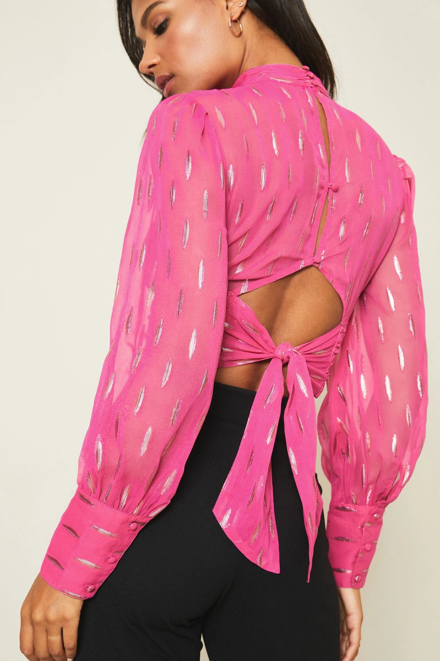 High neck top from Lipsy featuring long sleeves with a deep cuff. This style is a meet the jeans length and has a waist band detail with tie at back.