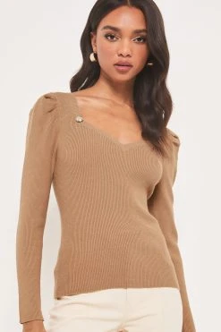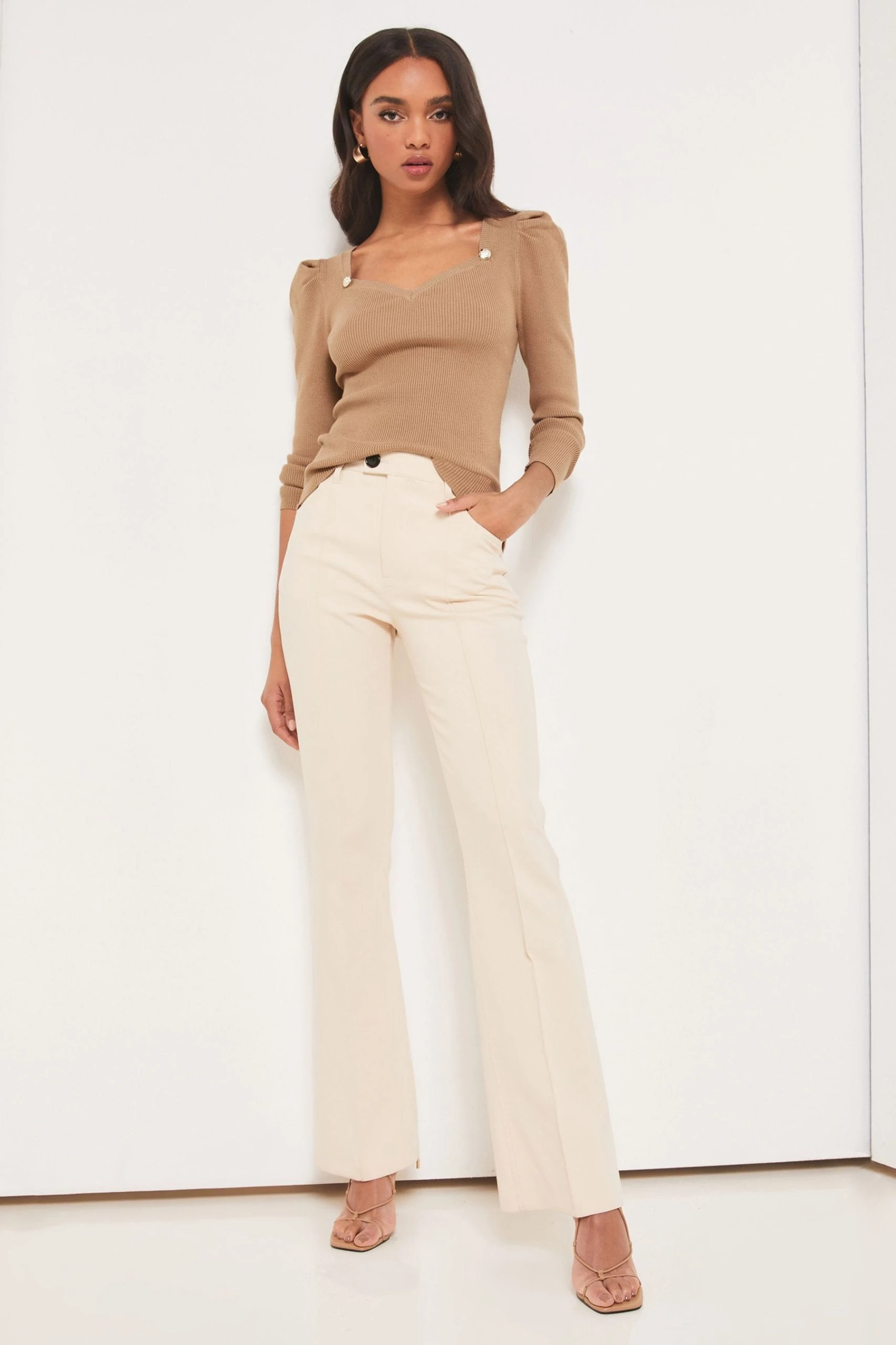 A gorgeous fine gauge button jumper, featuring a sweetheart neckline and rucked shoulder. Model wears size UK8.