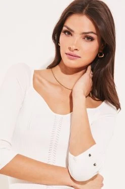A gorgeous long sleeve corset knitted top with a sweetheart neckline by Lipsy. Model wears size UK 8.