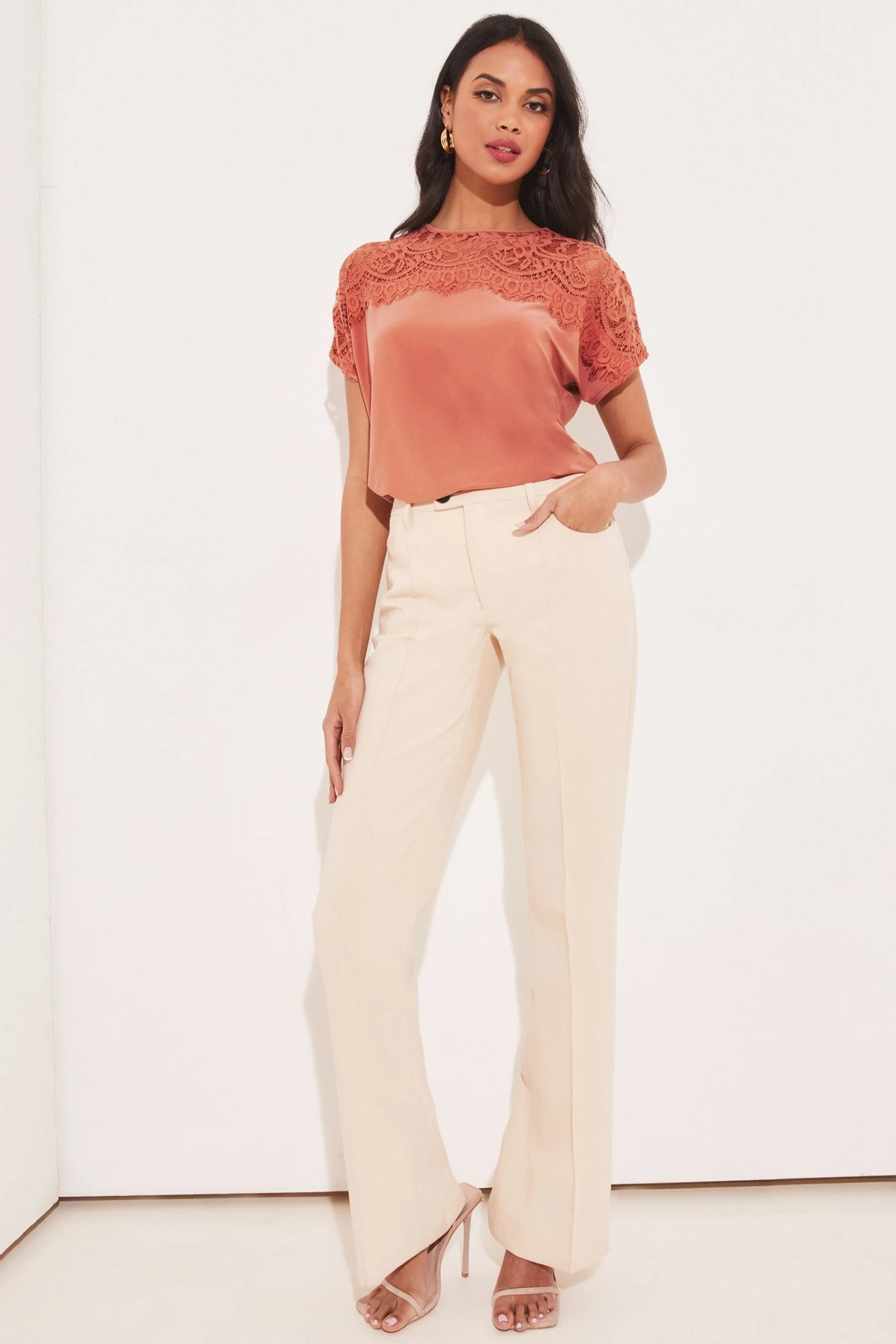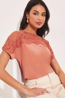 Regular fit T-shirt from Lipsy. This top features lace detailing on the yoke and a short sleeve. Perfect with jeans on the weekend or a tailored trouser for the office.