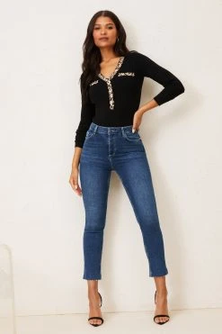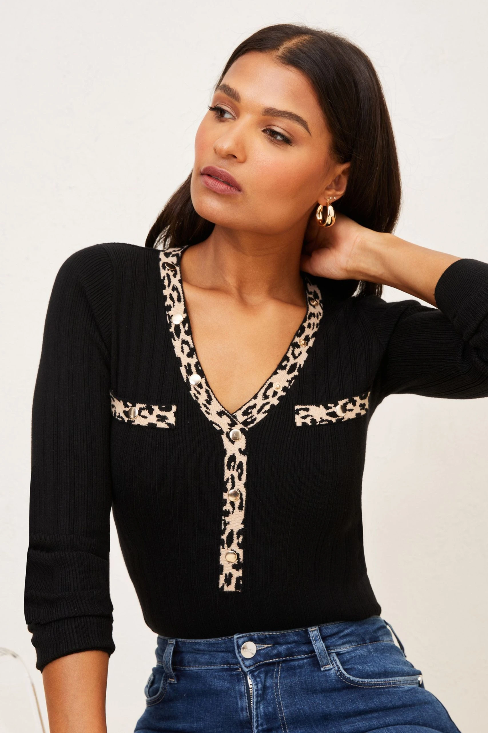 Long sleeve v neck jumper fine guage jumper, featruing hardwear button detailing, perfect to pair with denim for a casual occasion. Model wears UK8.