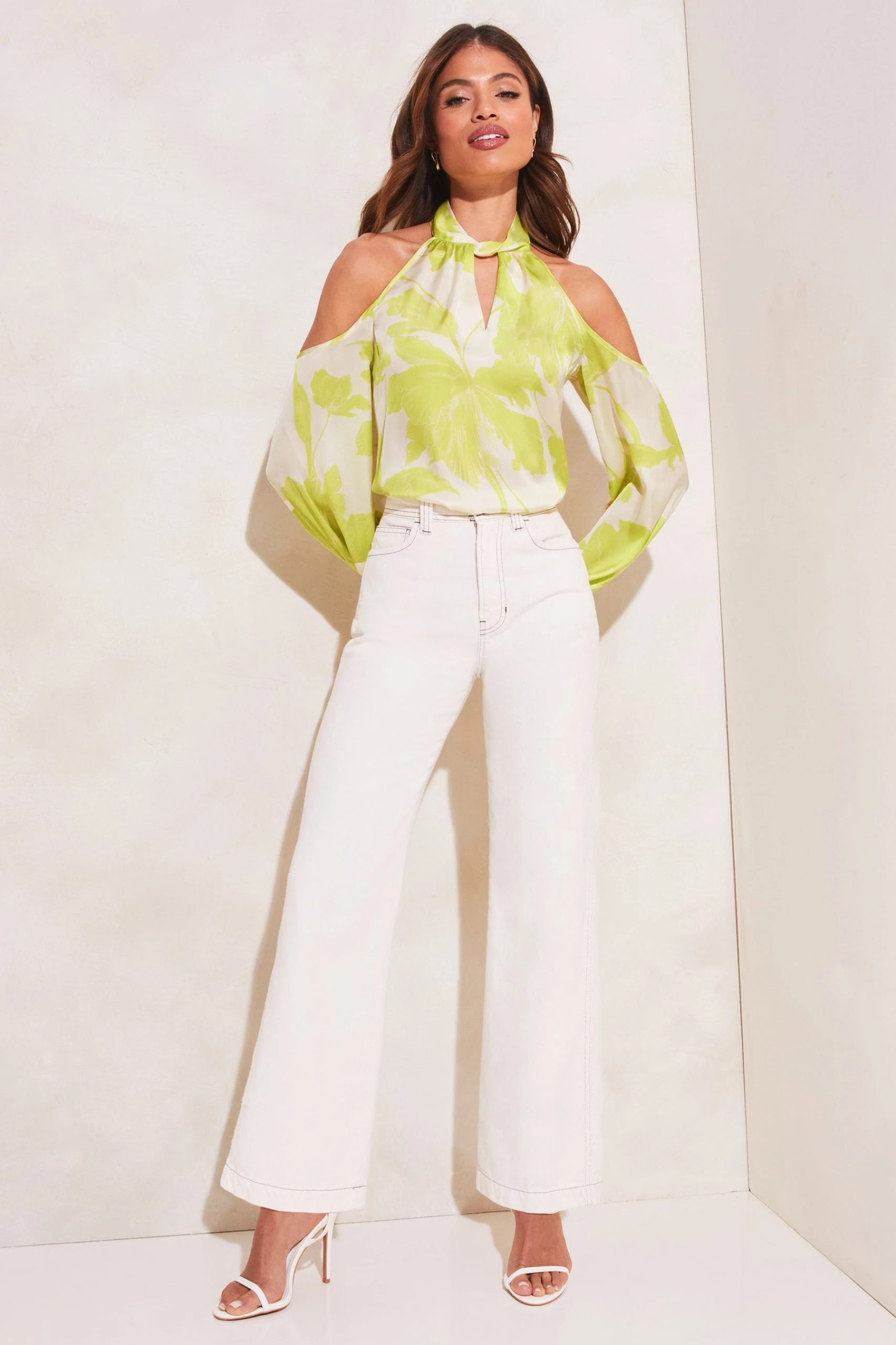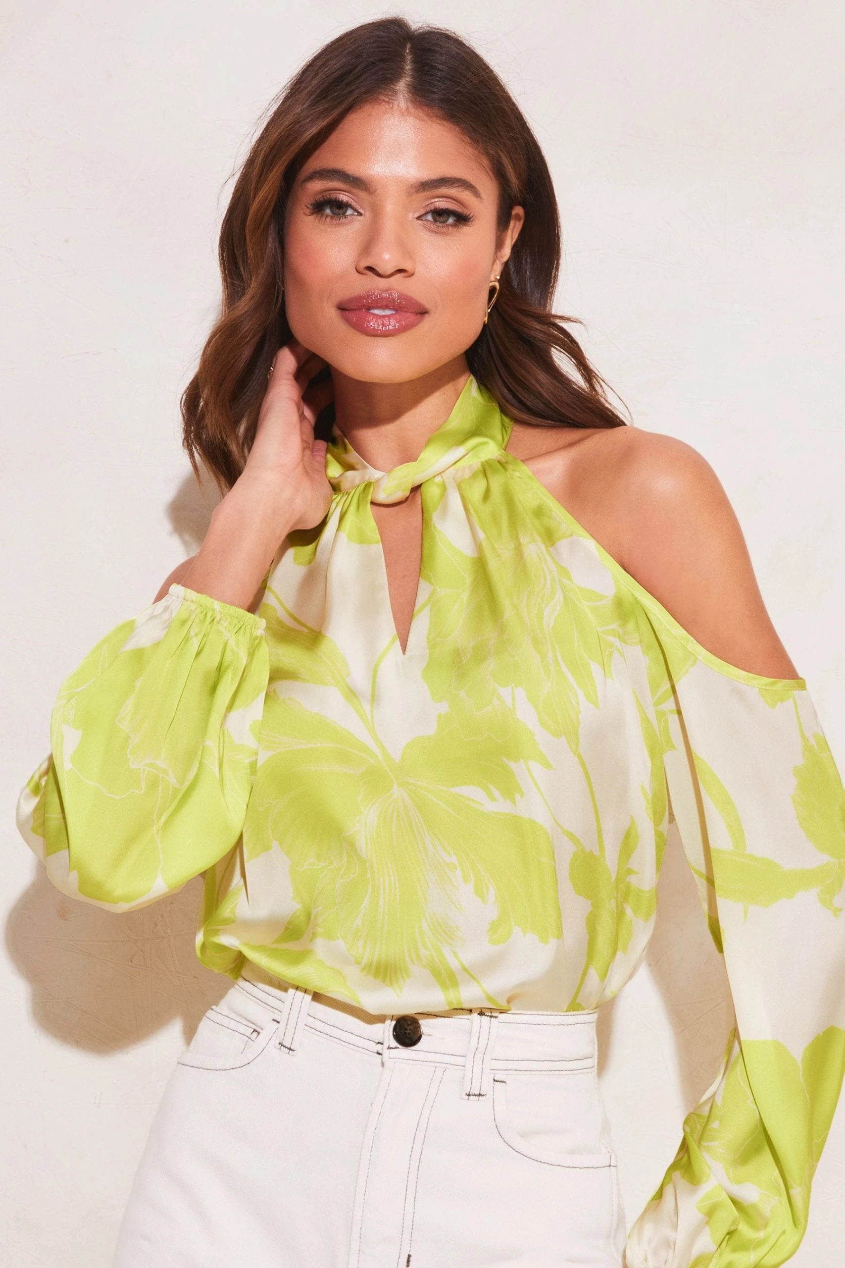 A beautiful cold shoulder top with an oversised floral print. This satin top matches perfectly back with a pair of jeans and heels.