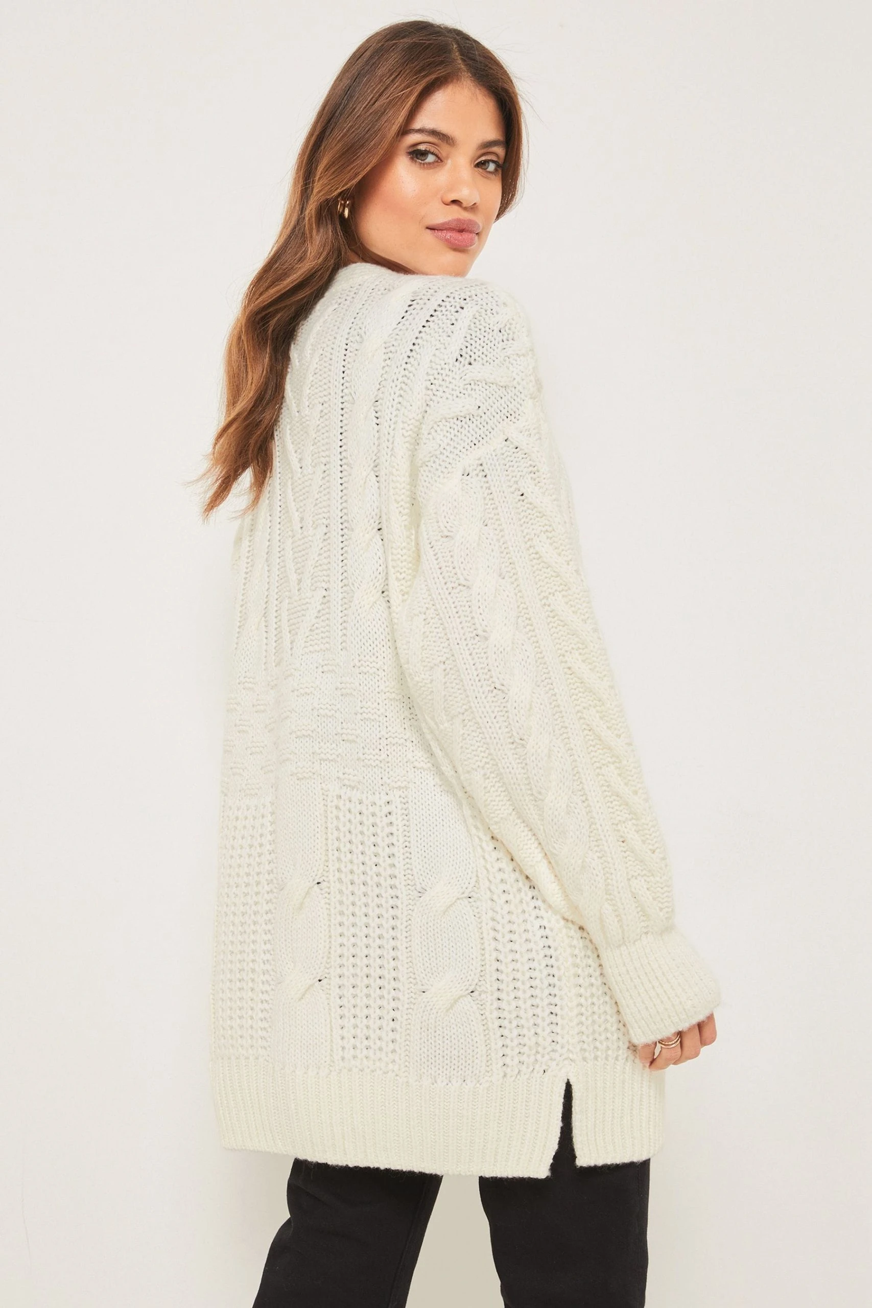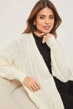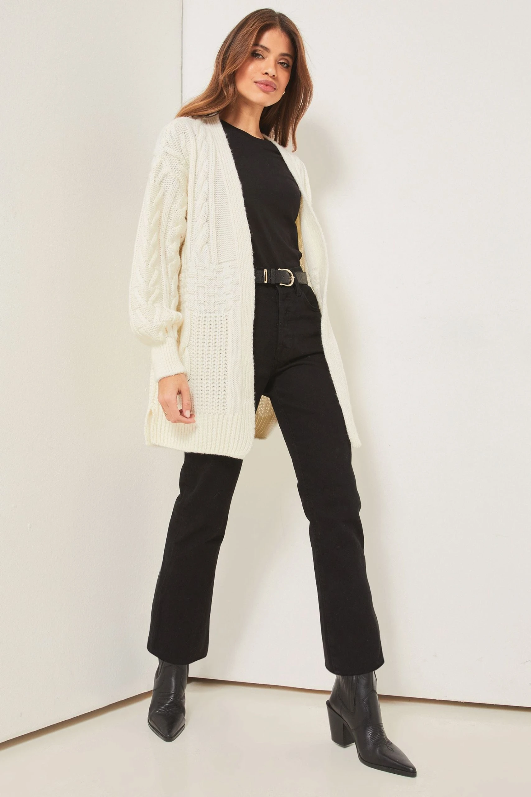 A gorgeous mixed cable cardigan. Model wears size UK8.
