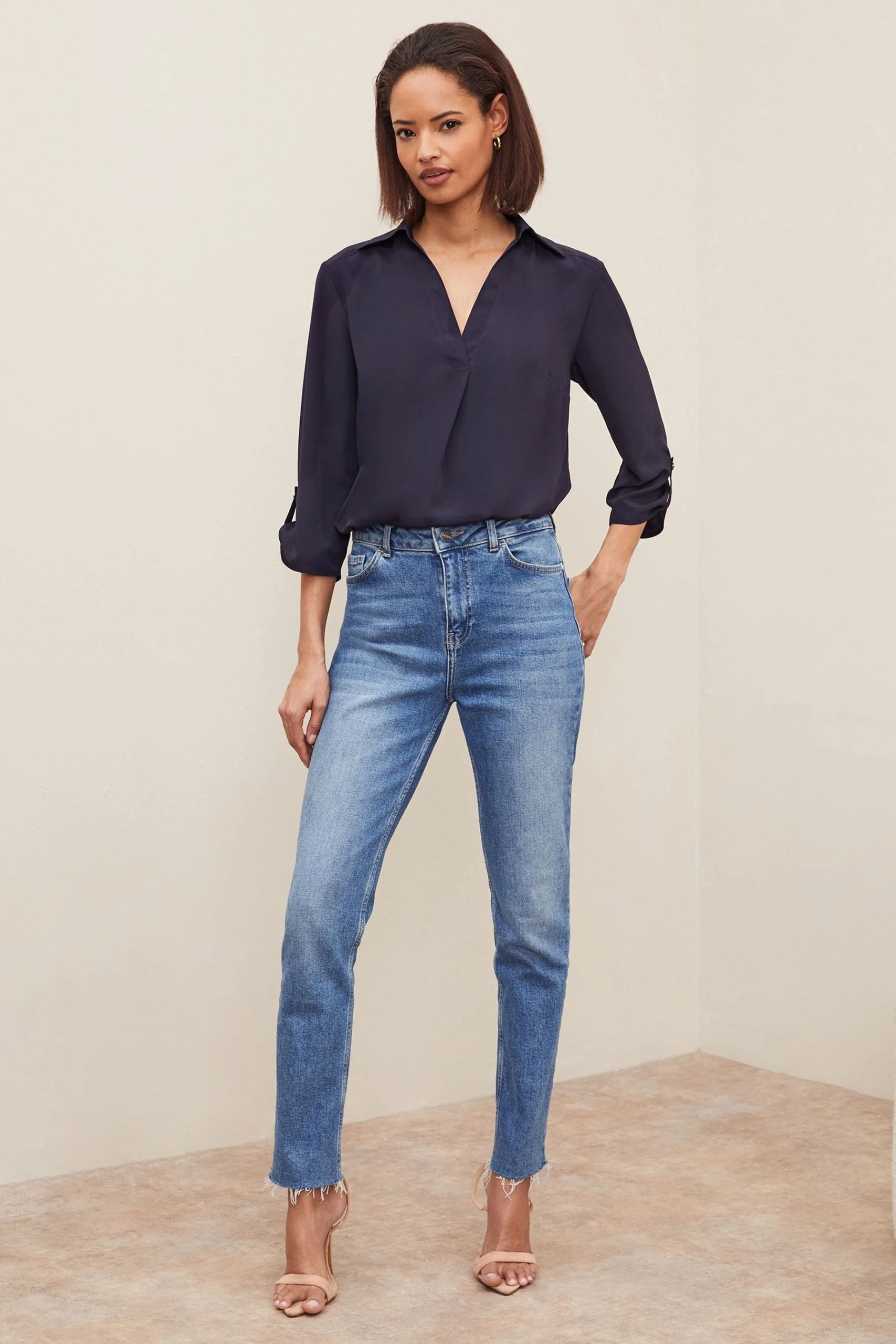 Relaxed fit blouse from Lipsy featuring a notch V neck neckline. This style has 3/4 sleeves with a roll up and tab. A smart blouse, perfect for every day wear.