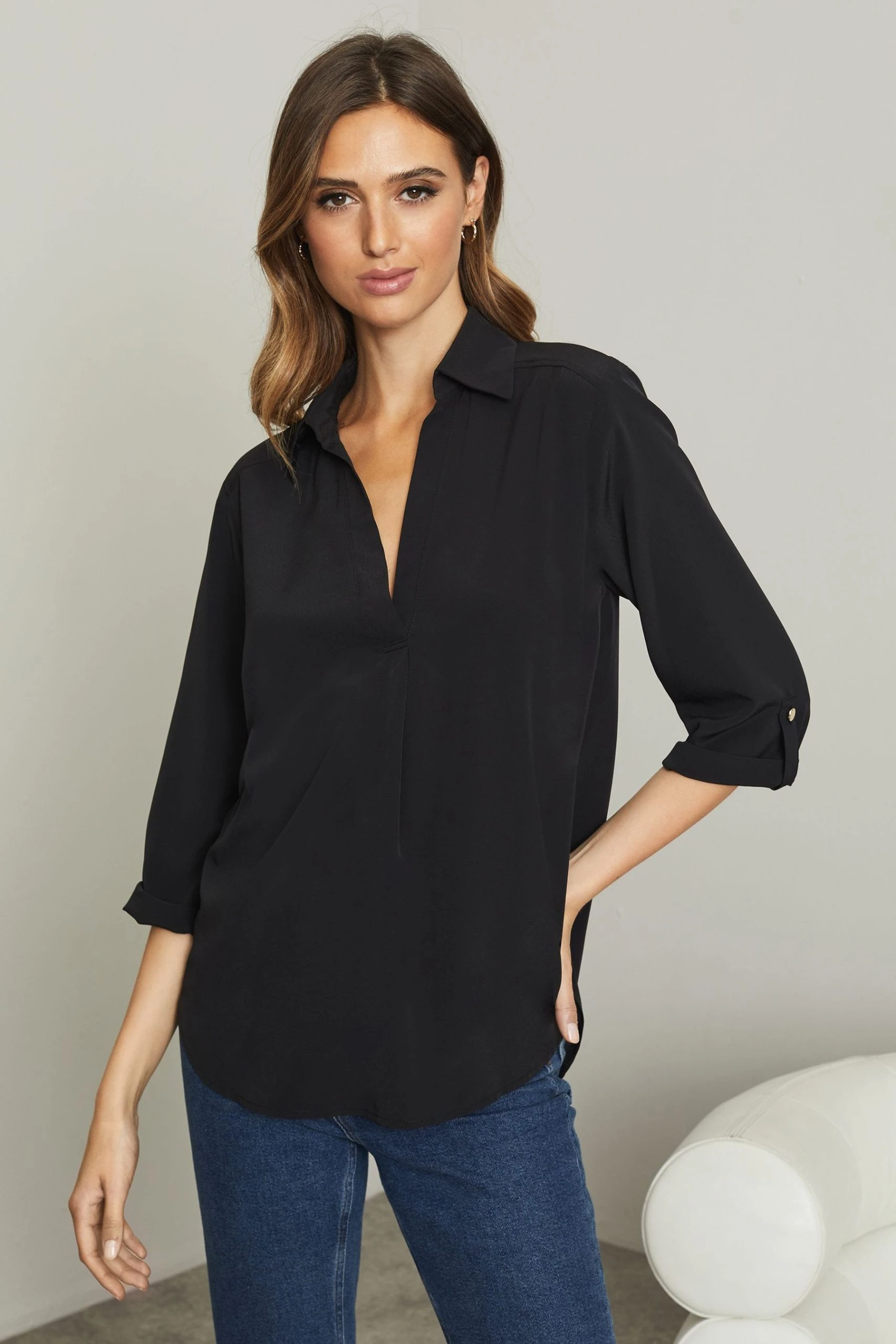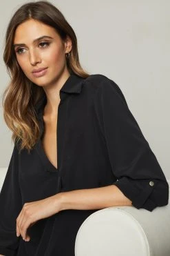 Relaxed fit blouse from Lipsy featuring a notch V neck neckline. This style has 3/4 sleeves with a roll up and tab. A smart blouse, perfect for every day wear.