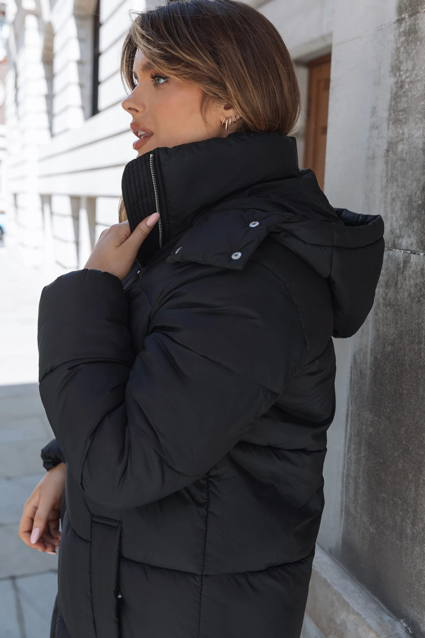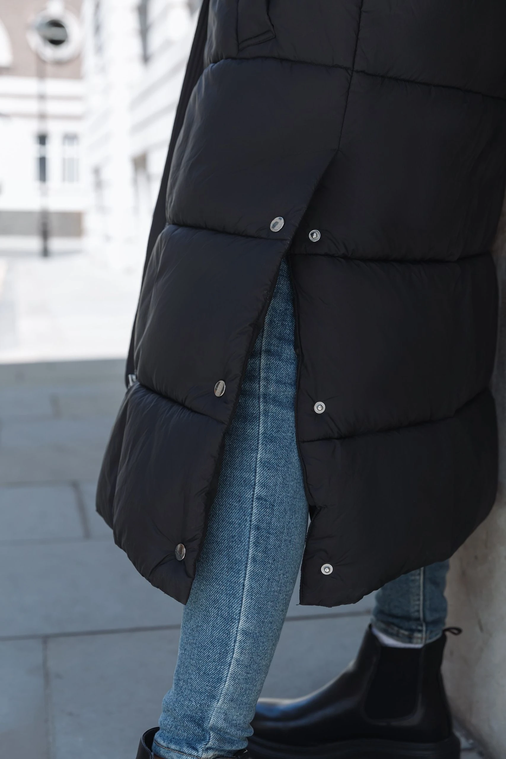 This longline padded duvet coat is available in a choice of colours. Designed to finish below the knee to keep the cold weather out. Finished with a hood and Lipsy branded trims. Model wears size 8.