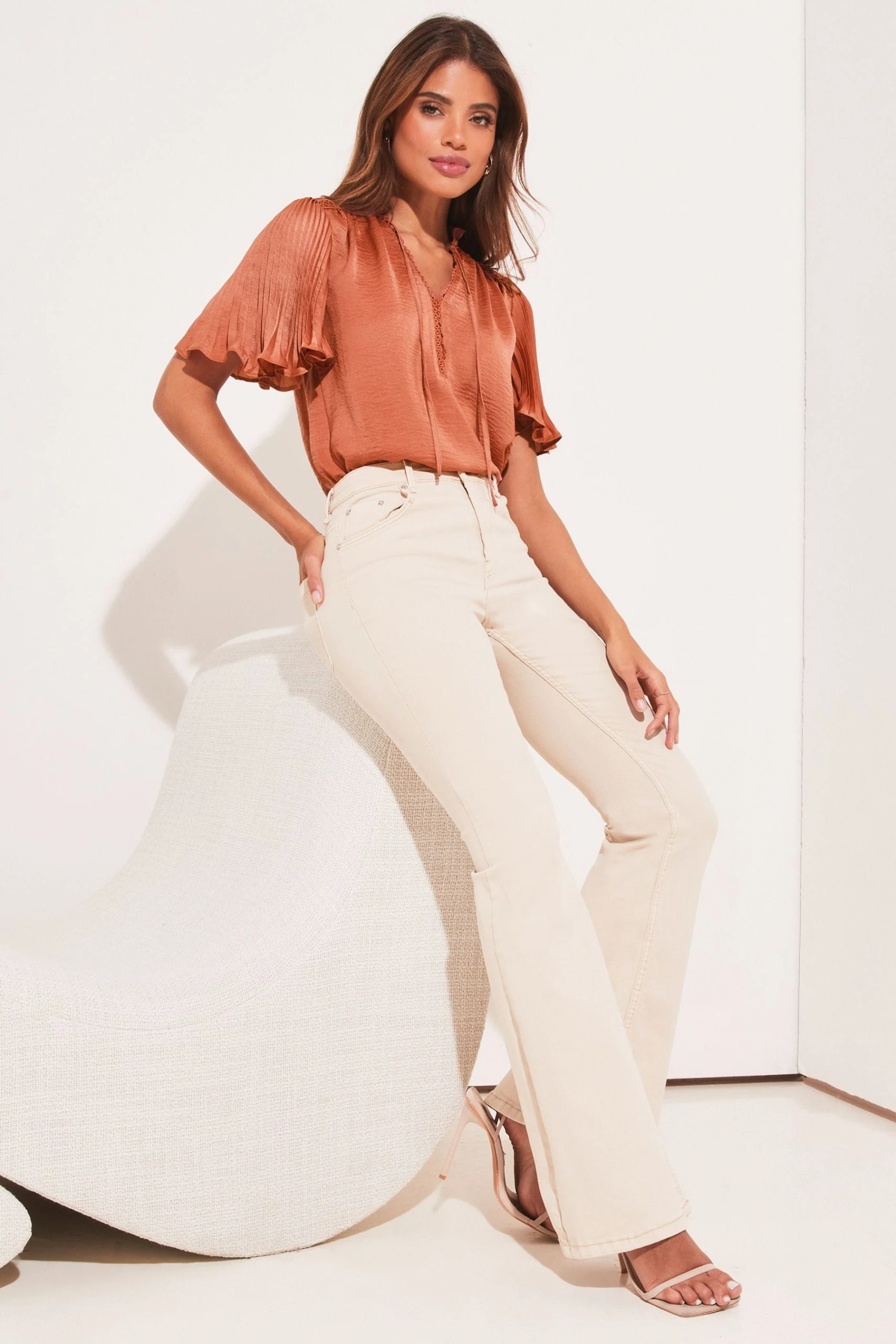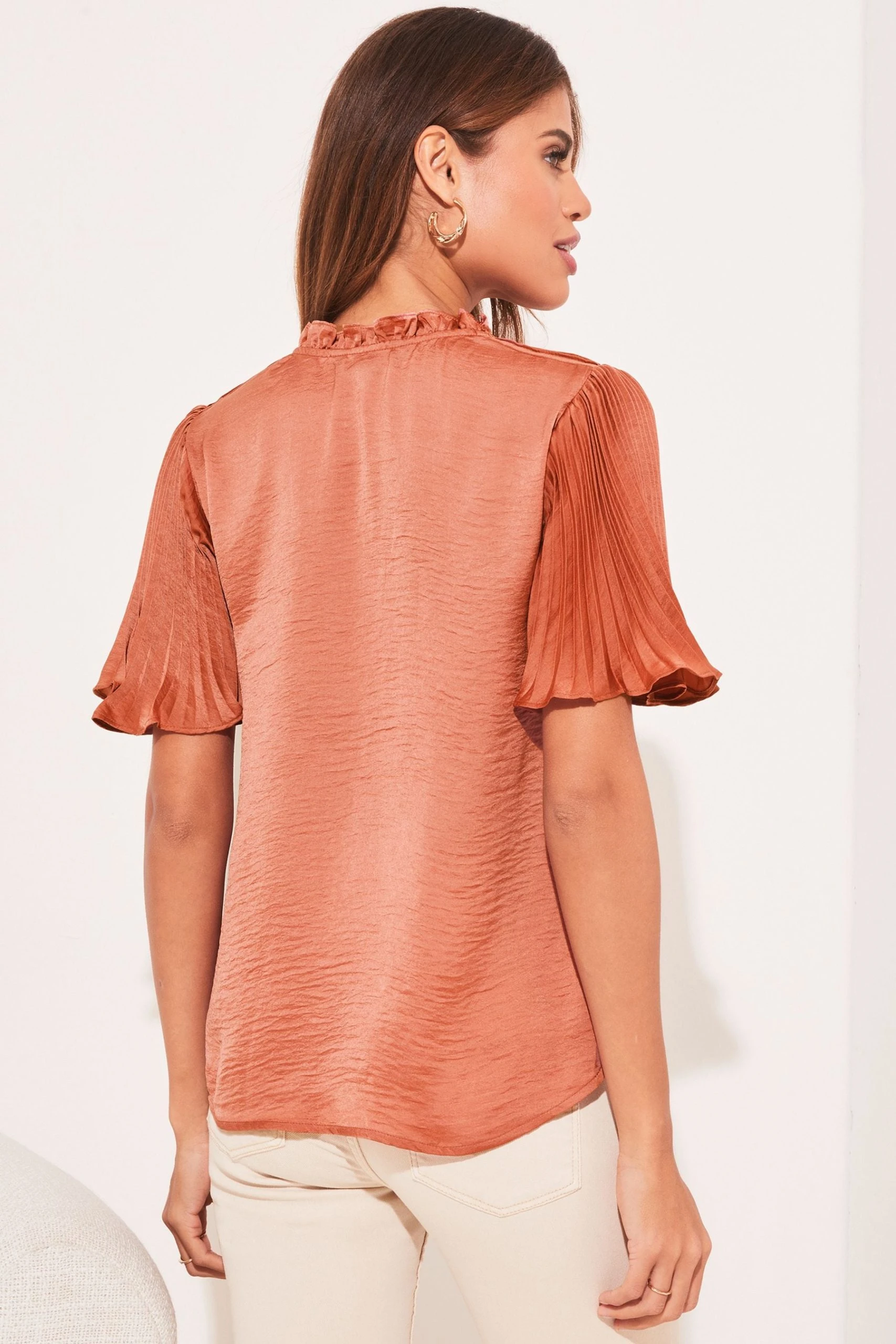 Regular fit top from Lipsy featuring a pleated angel sleeves and neck tie detailing. Perfect for desk to dinner.