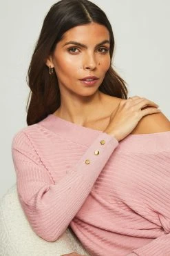 An effortlessly stylish ribbed jumper featuring a slash neck. Model wears size UK8.