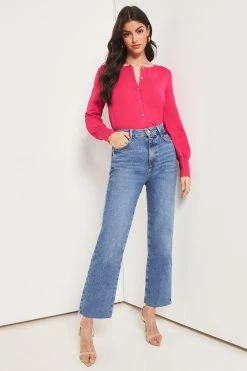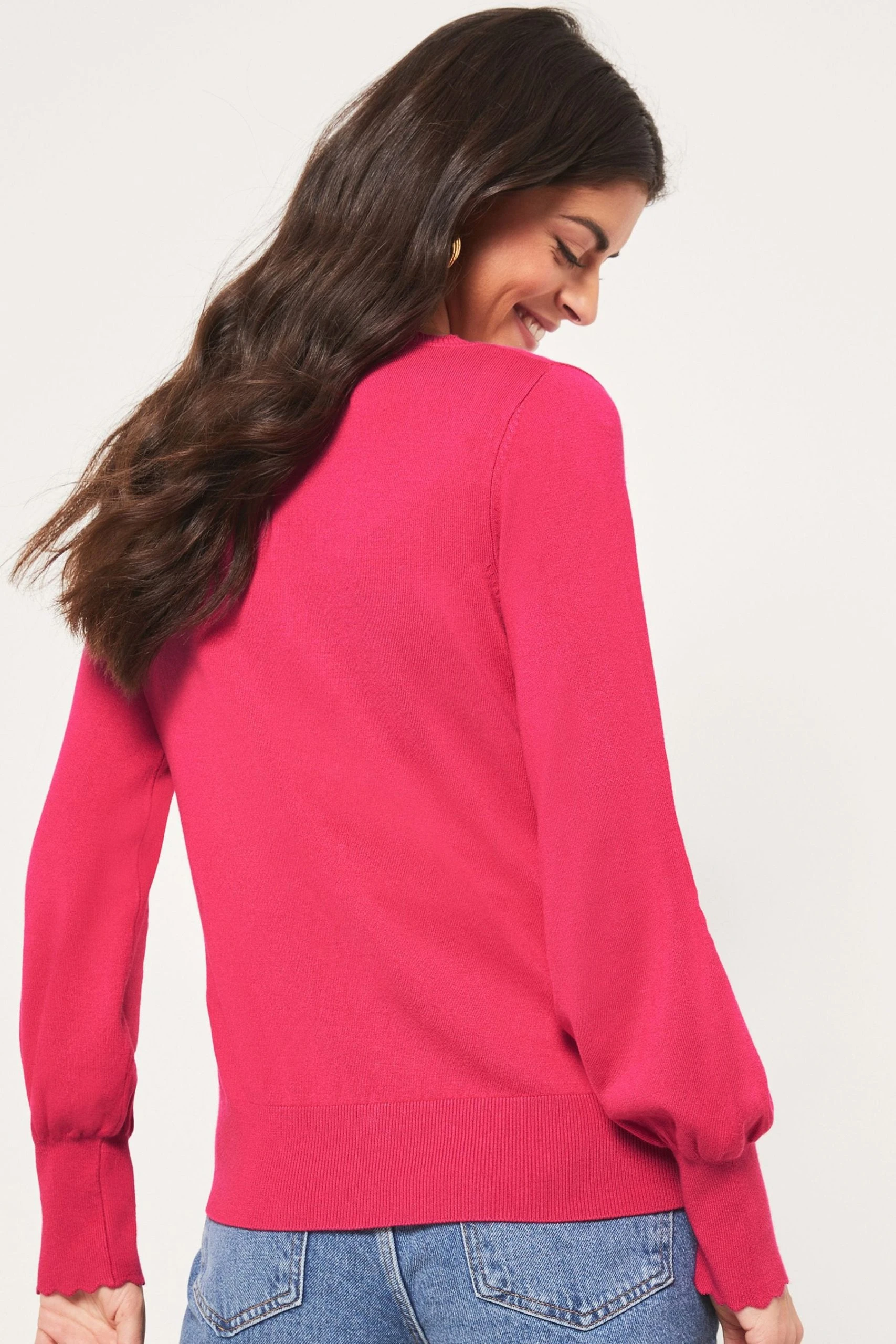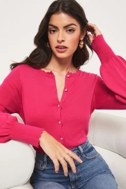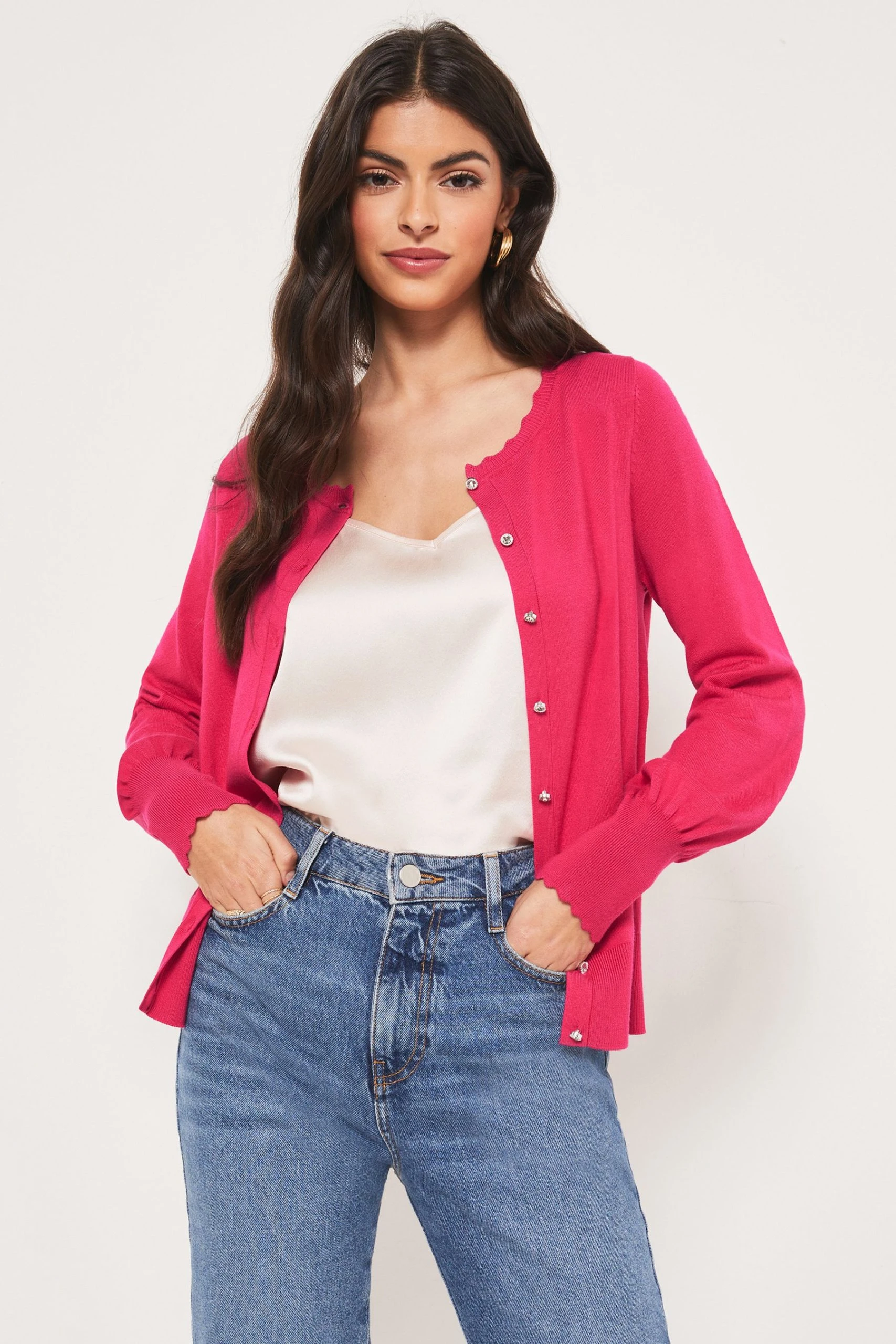 A classic piece your can wear all year round. Lipsy fine gauge knitted cardigan in long sleeve with scallop trim detailing and tipping. Model wears UK 8.