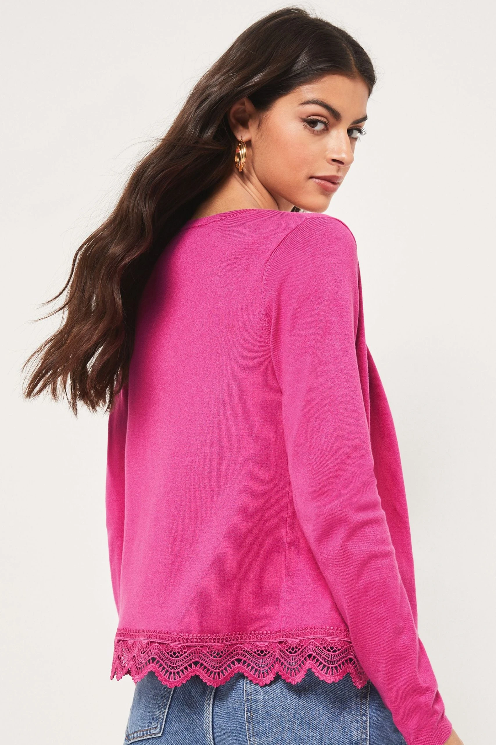 Short knitted cardigan featuring an beautiful laced hem. Model wears size UK 8.