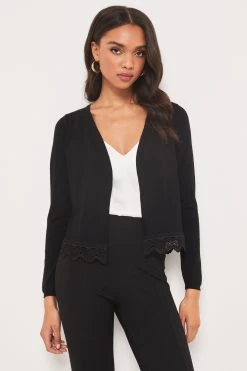 Short knitted cardigan featuring an beautiful laced hem. Model wears size UK 8.