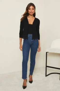 Short knitted caridgan featuring an beautiful laced hem. Model wears wise UK8.