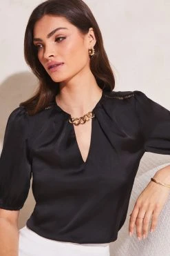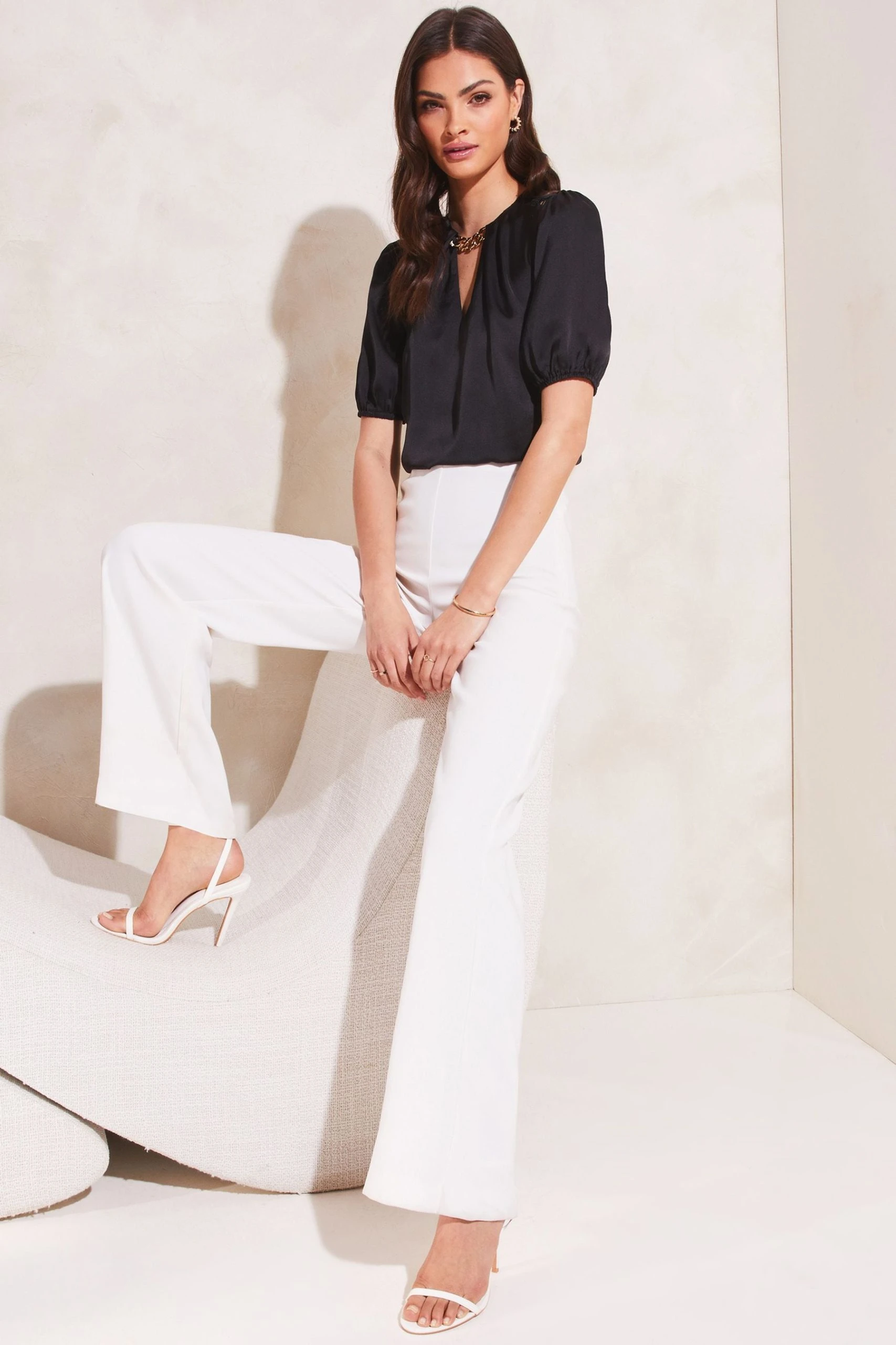 A short puff sleeved blouse from Lipsy. This top feautures a keyhole cut out accented with a gold chain. The soft satin drapes beautifully and is perfect for both work and evenings out.