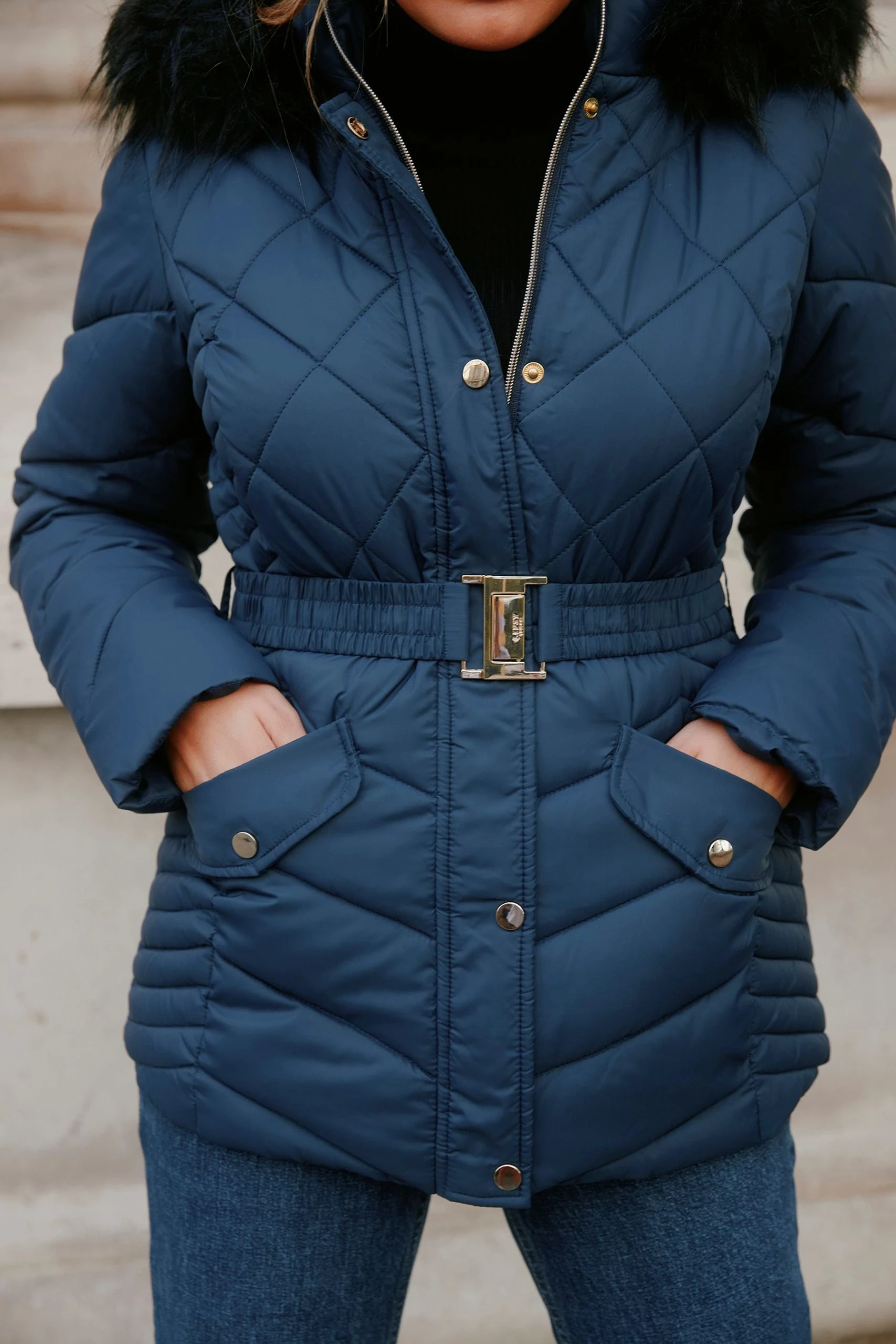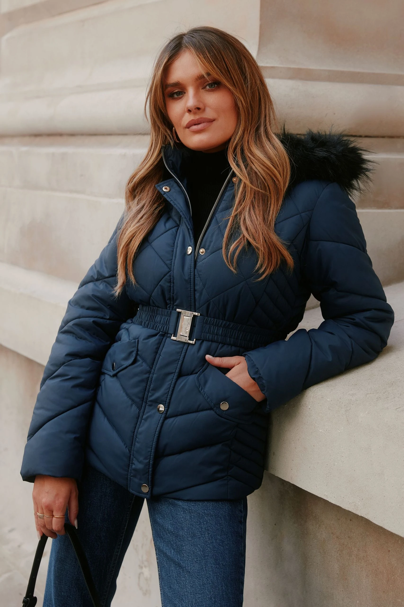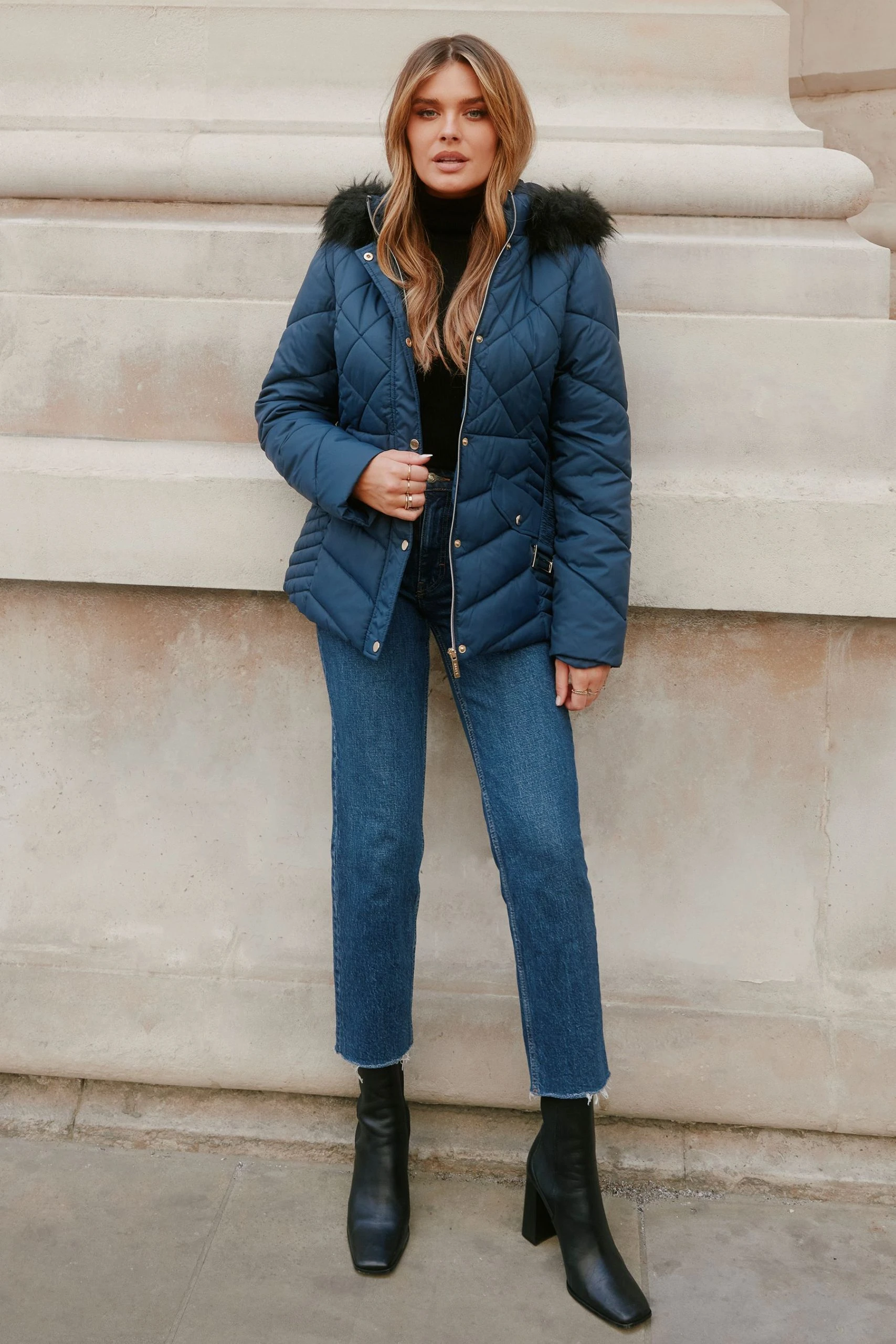 A quilted padded jacket with a fitted silhouette, available in an array of colours. Designed with a faux fur trimmed hood and front zip with placket fastening to keep the cold weather out. Finished with Lipsy branded trims including buckle belt to draw in the waist. Model is wearing a size 8.