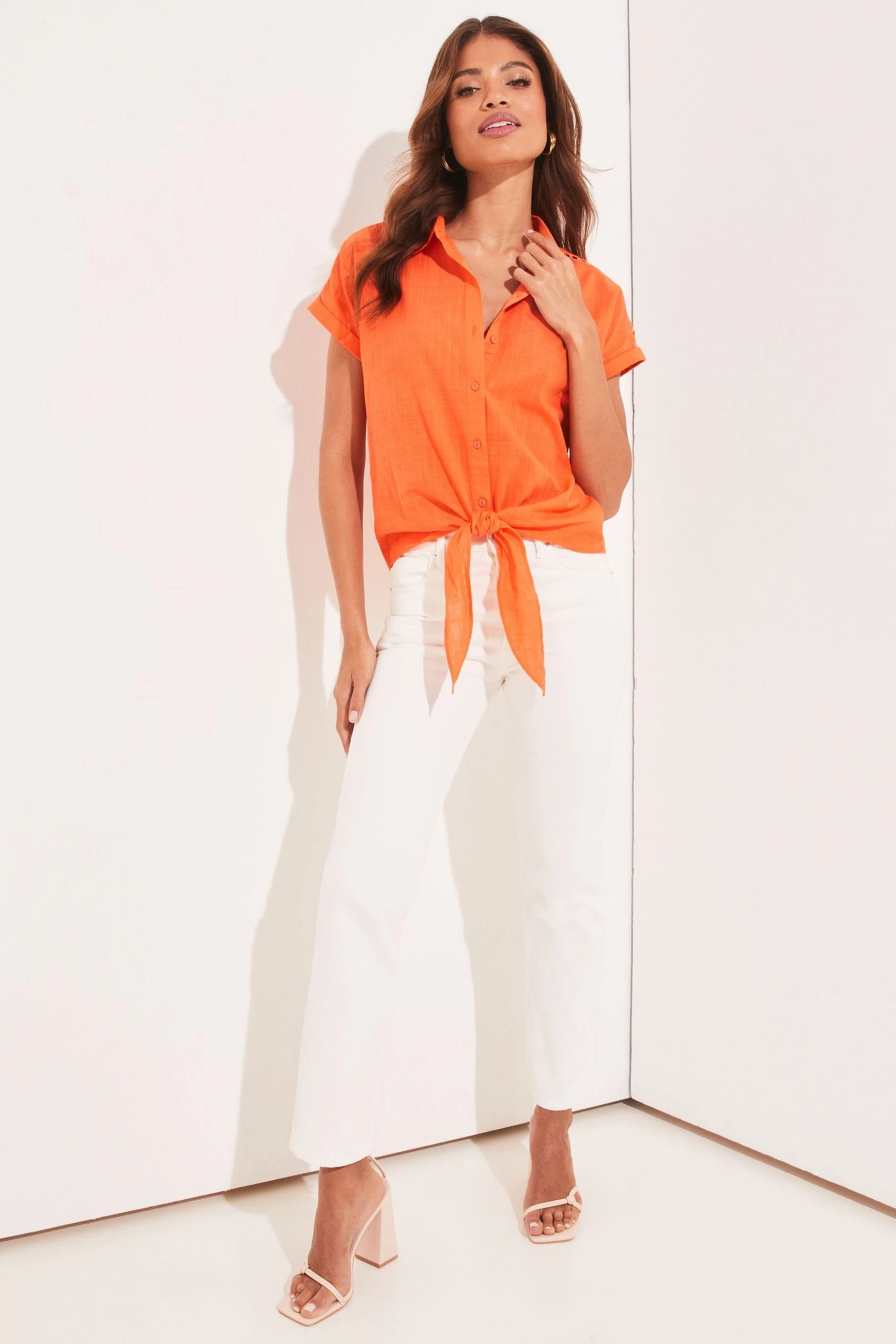 This gorgeous short sleeve shirt from Lipsy is Spring/Summer wardrobe essential. Featuring a tie front detail and made in a soft linen fabric this top is as stylish as it is comfortable.