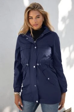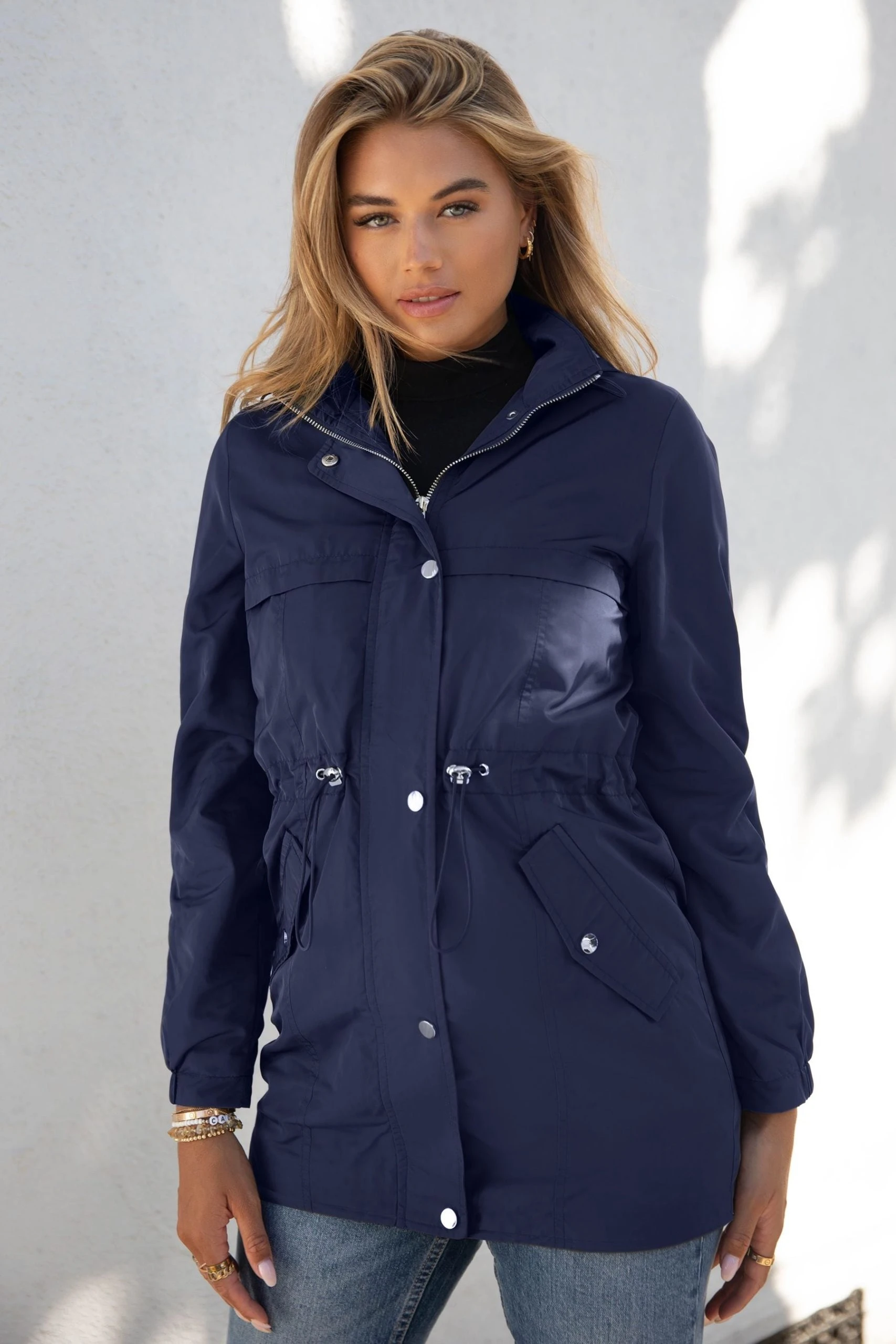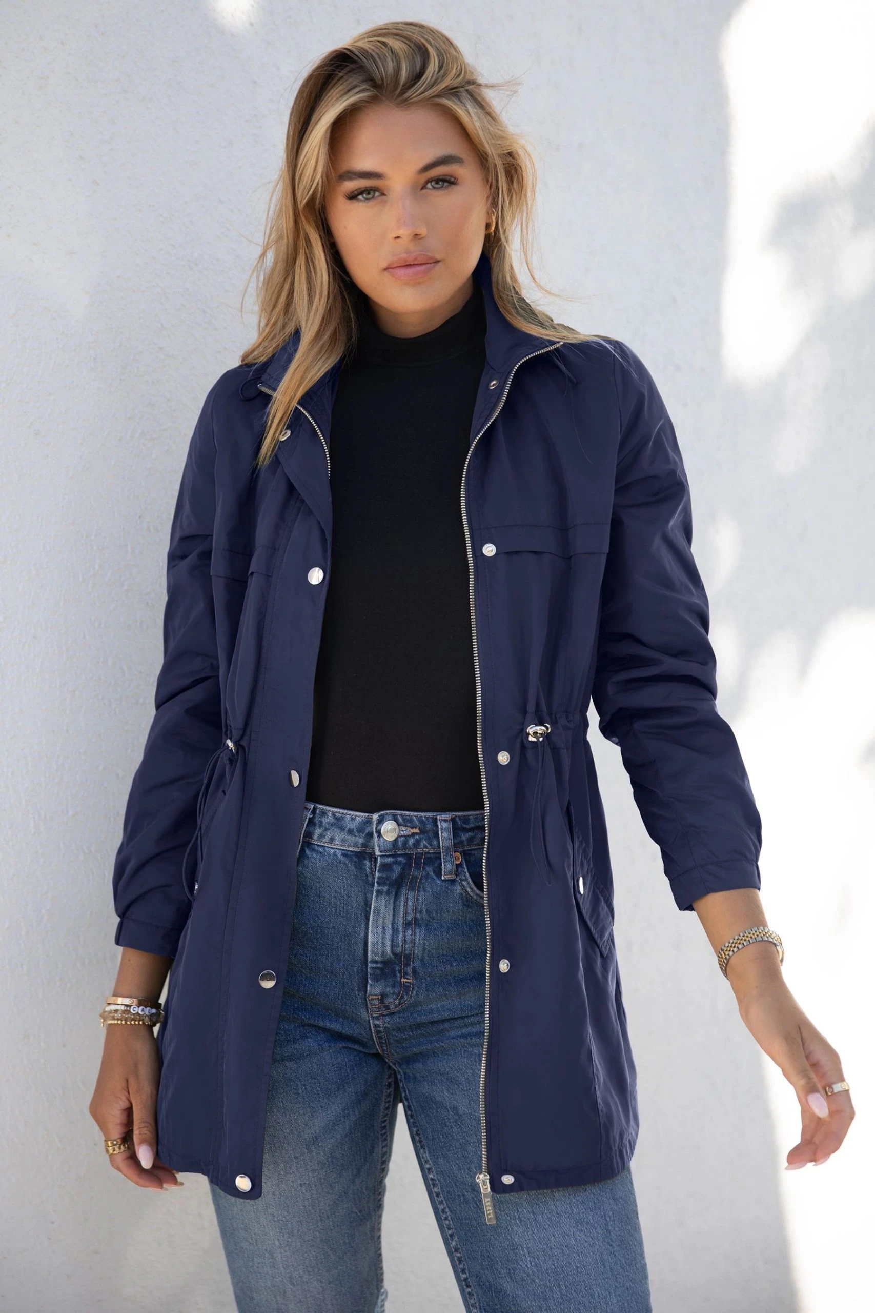 This rain jacket is made from a lightweight fabric with shower resistant coating to provide protection from light rain. Designed with drawcord detail at the waist to give a flattering silhouette. Finished with pockets and metallic trims. Model wears size 8.