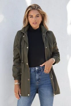 This rain jacket is made from a lightweight fabric with shower resistant coating to provide protection from light rain. Designed with drawcord detail at the waist to give a flattering silhouette. Finished with pockets and metallic trims. Model wears size 8.