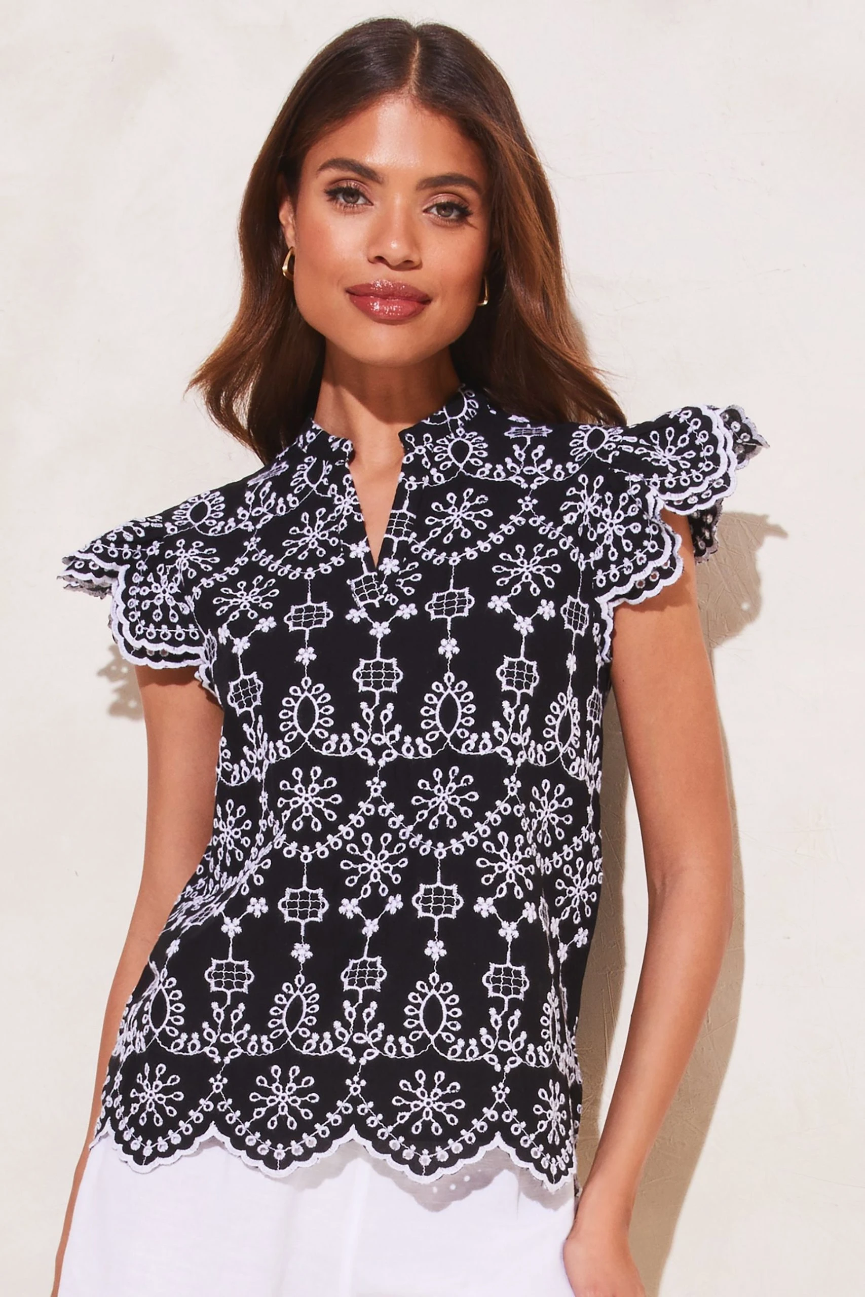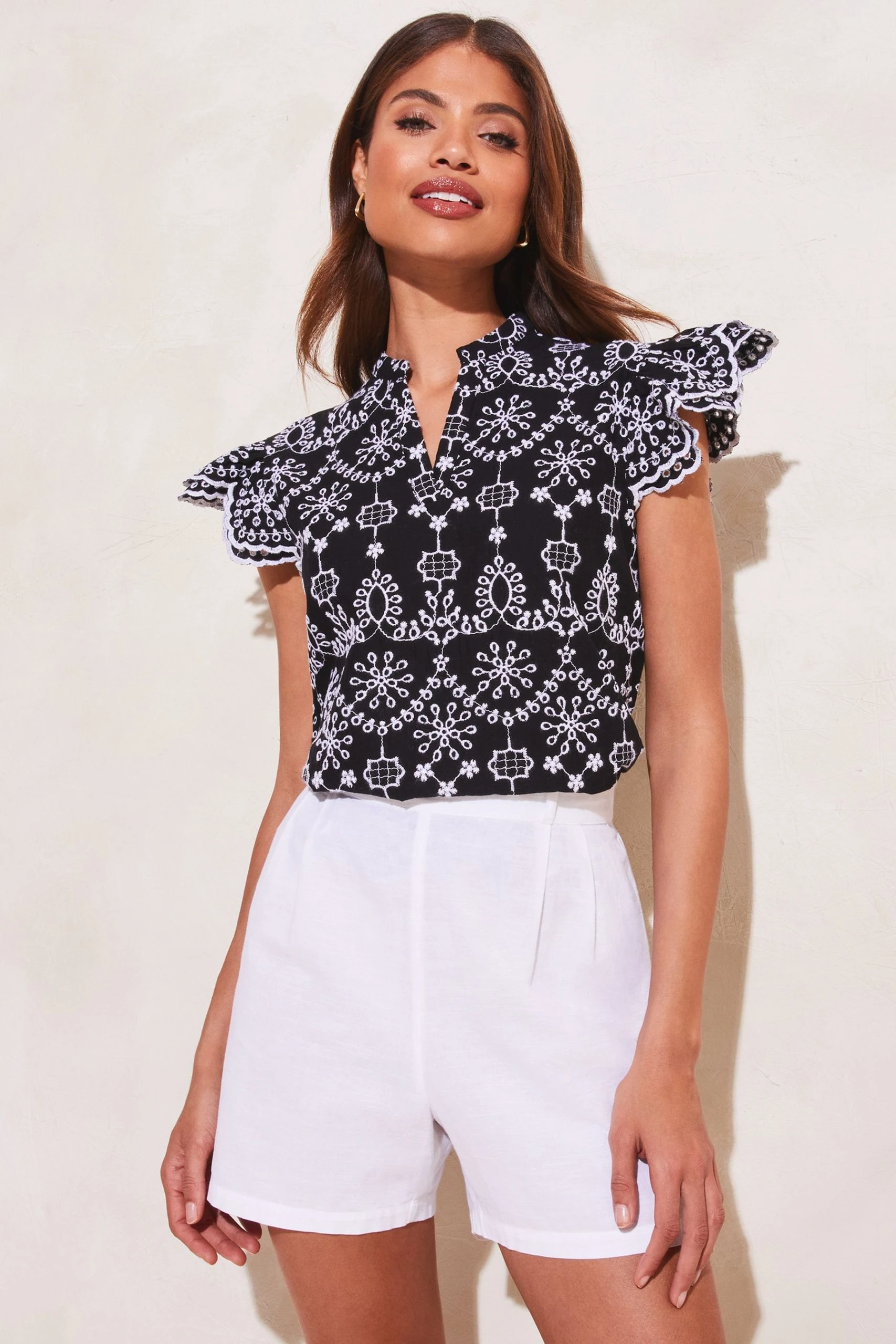 Update your Spring/Summer wardrobe with this gorgeous broderie top from Lipsy. This style is sleeveless with ruffle frill detailing on the shoulder and a V neckline.