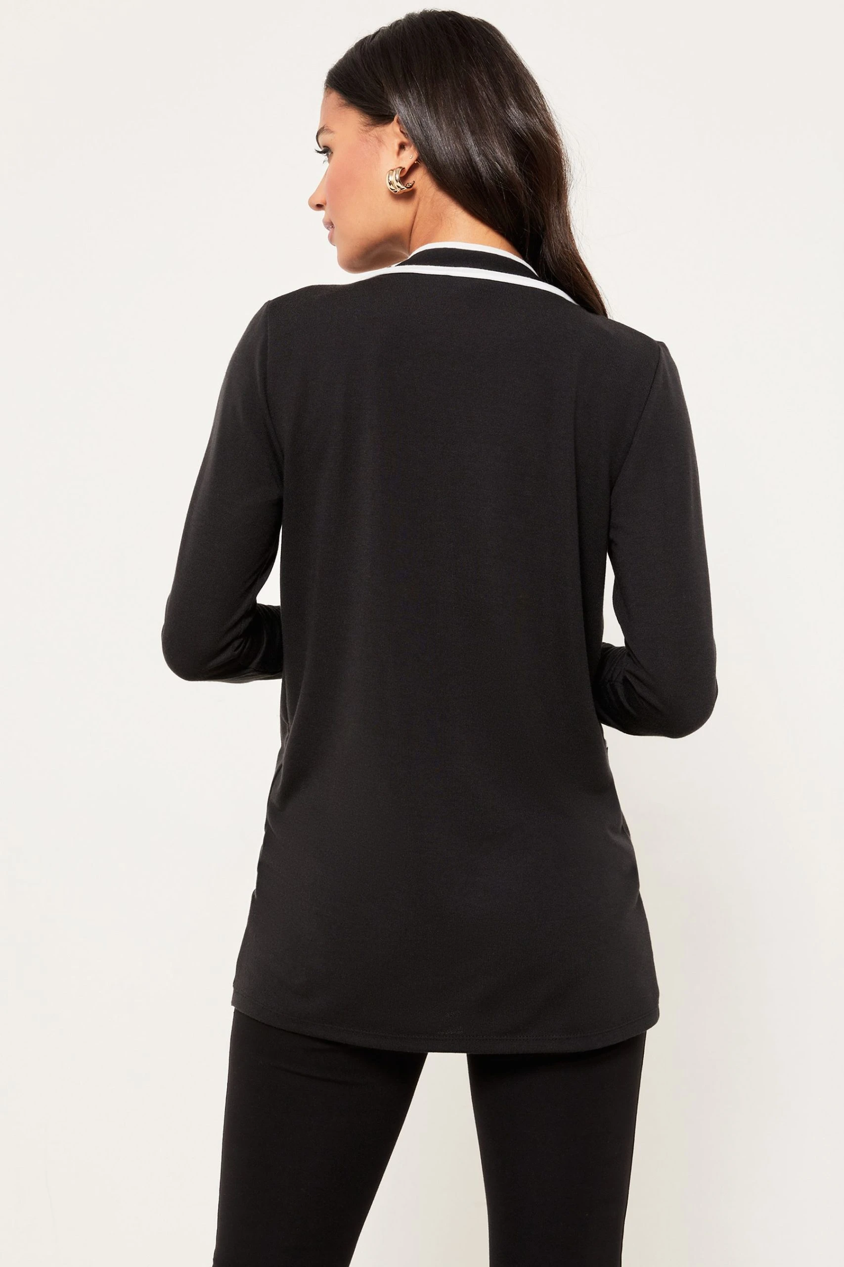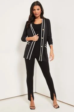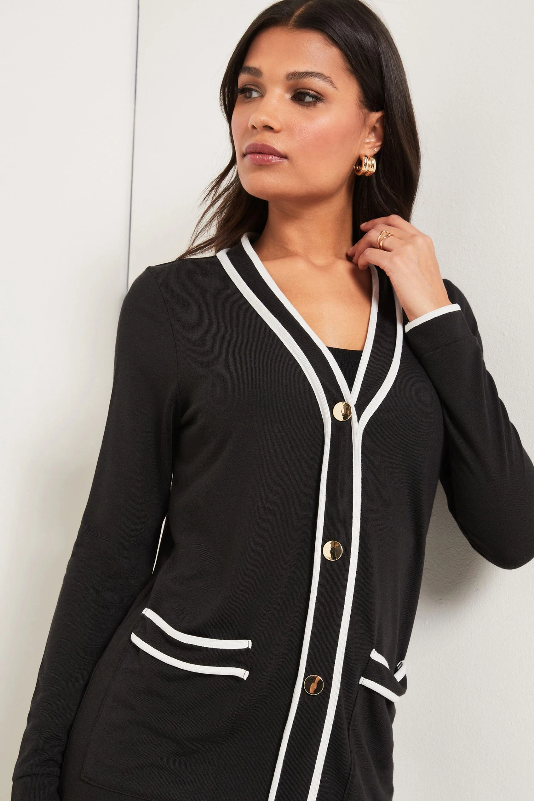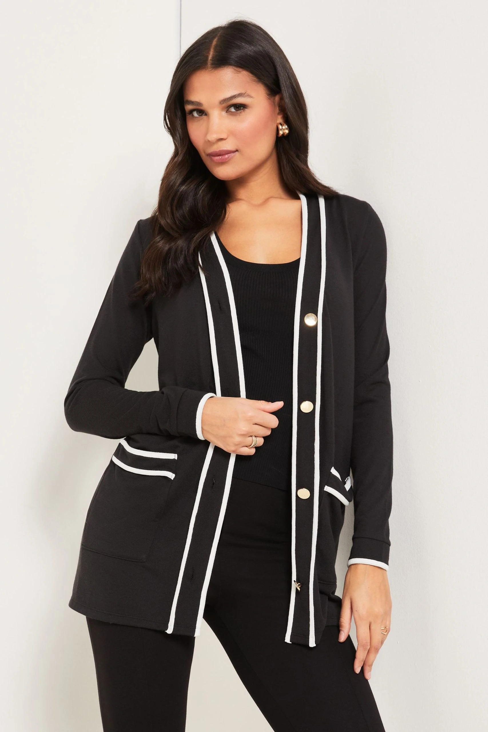 Mid length cardigan with two functional pockets and long sleeves. This style has has tipped edge detailing. This is a perfect extra layer for every day dressing.