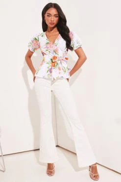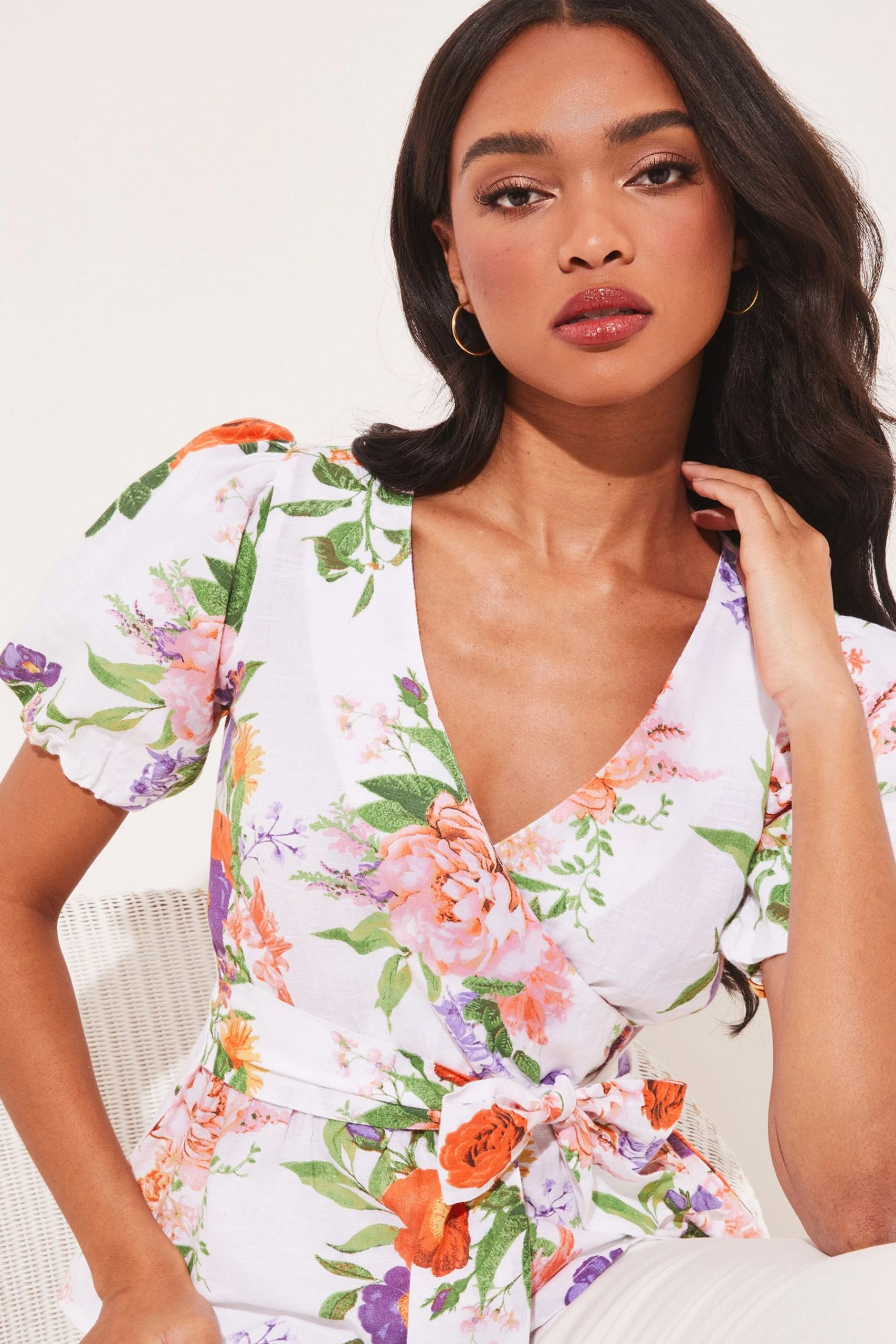 Update your wardrobe with this gorgeous linen wrap top. This top features a puff sleeve and a tie detail at the waist. Pair with your favourite jeans for the perfect Spring/Summer look.