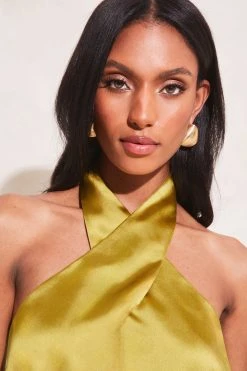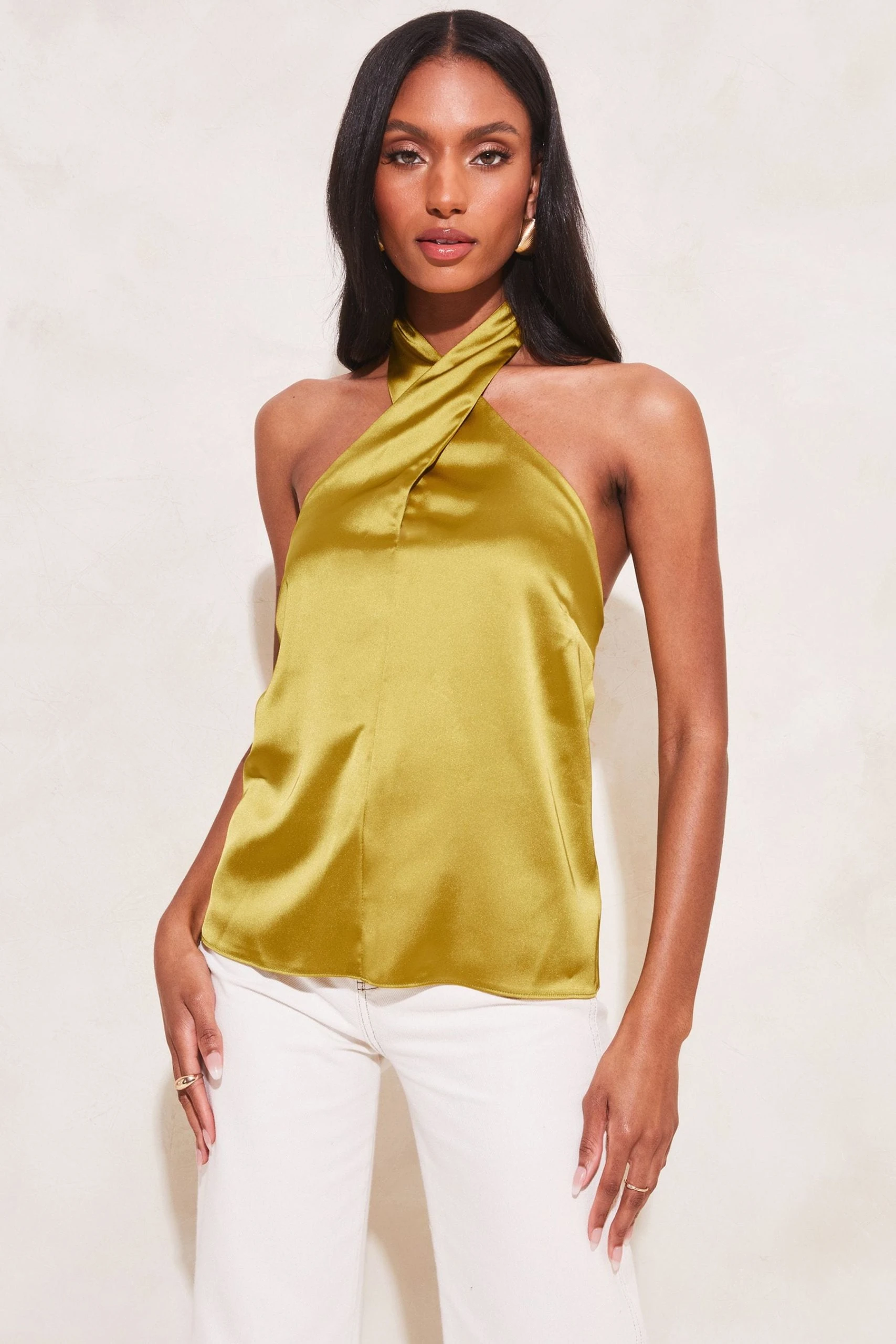 Update your Spring/Summer wardrobe with this wrap neck satin halter top from Lipsy. This style is regular length and has a button fastening at the neck.